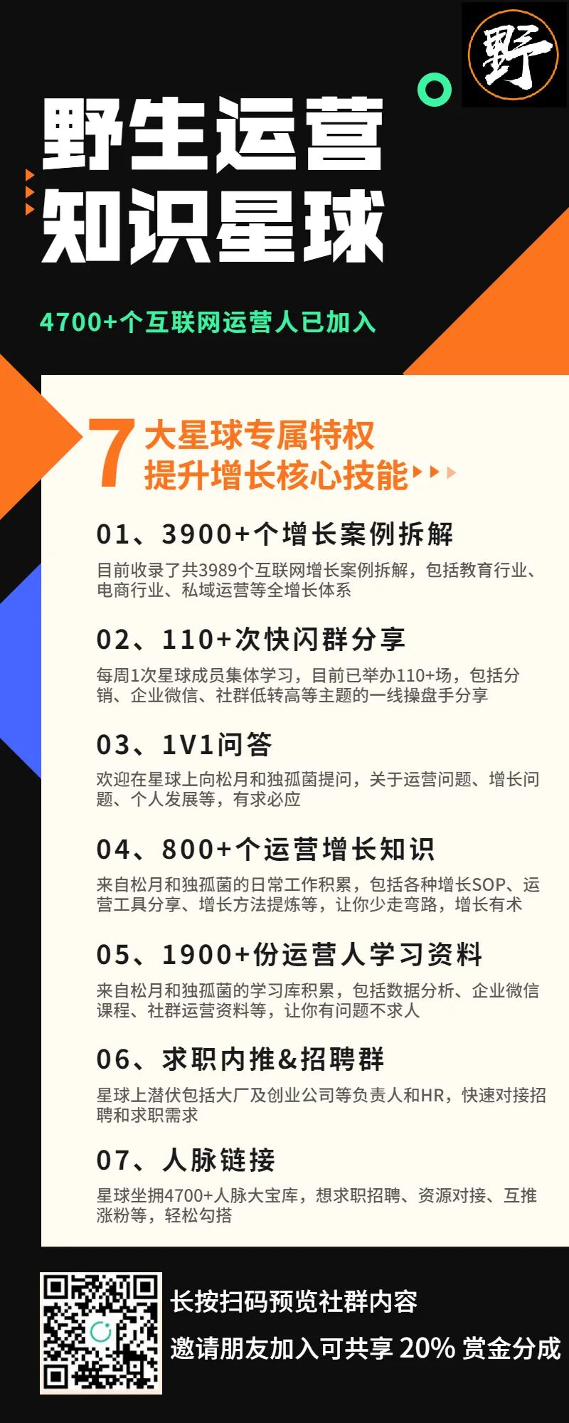 欢迎加入野生运营星球,每周一次快闪分享、运营人学习一手资料、1V1答疑……等硬核干货,而且还能一次入手包括 《2021上半年增长案例合集》、3989 个案例拆解全库、110+ 场群分享的音频+逐字稿、N多运营工具包和资料,就问你一句,值不值?