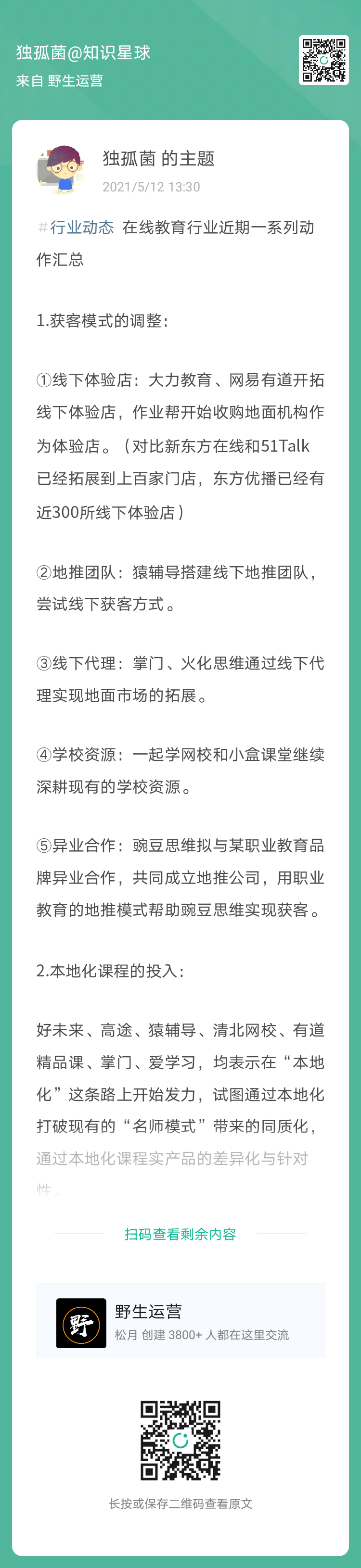 欢迎加入野生运营星球,每周一次快闪分享、教育圈一手资料、1V1答疑……等硬核干货,而且还能一次入手包括 《2020年教育圈增长案例合集》、3508 个在线教育圈案例合集全库、70 页下沉市场观察合集、95 场群分享的音频+逐字稿、N多运营工具包和资料,就问你一句,值不值?