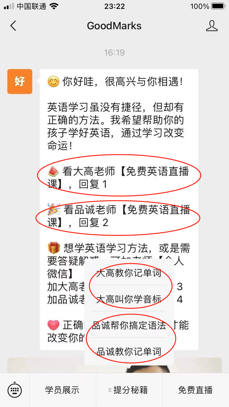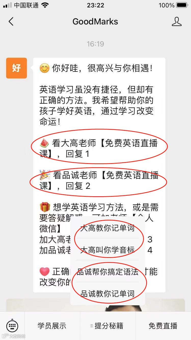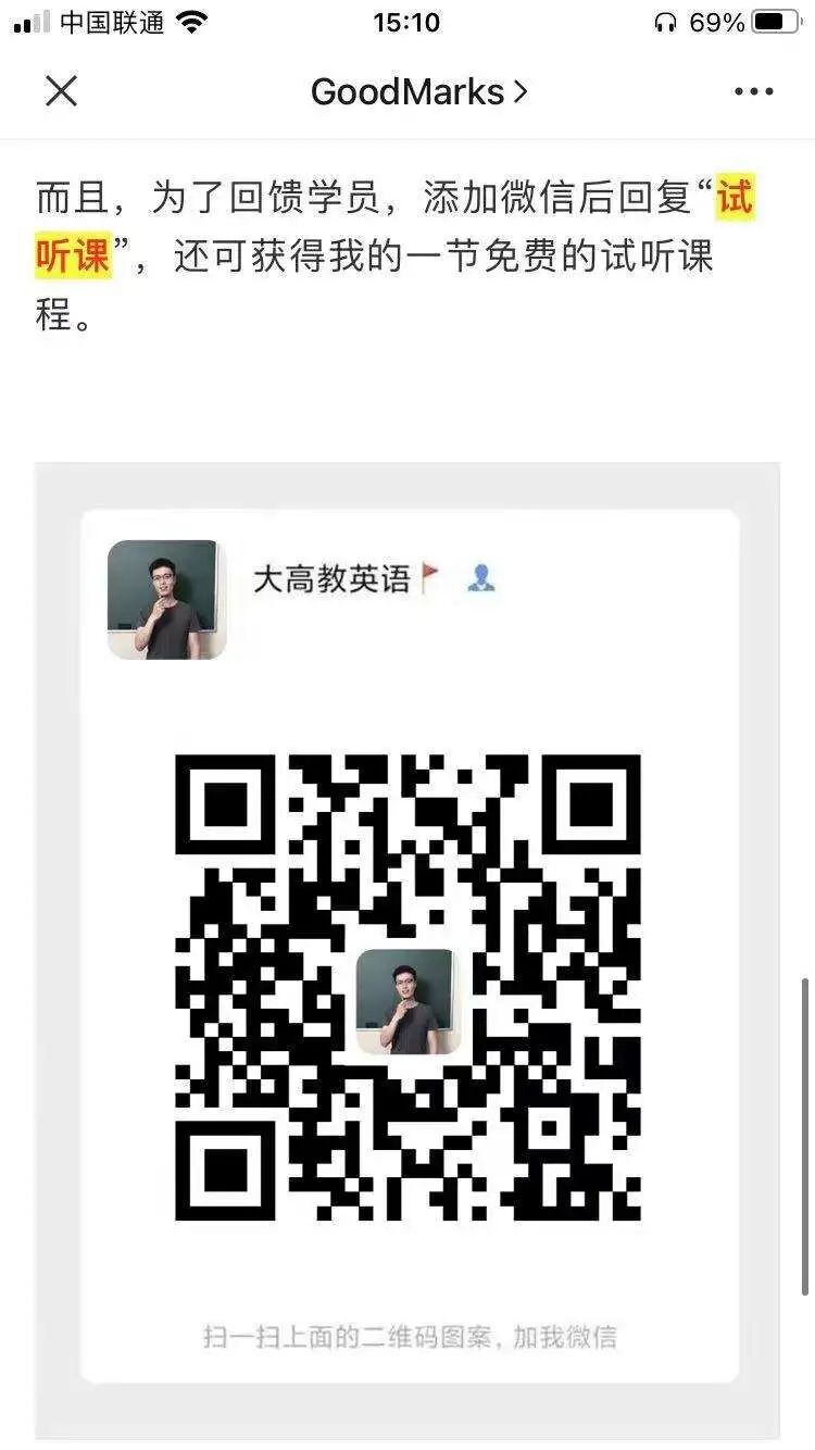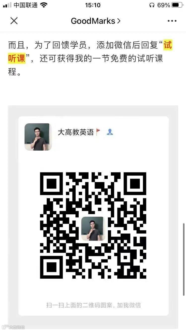 视频下方评论区链接告知用户如何免费听直播和试听课→点击转到公众号GoodMarks→扫码添加企业微信→免费试听课→正价课