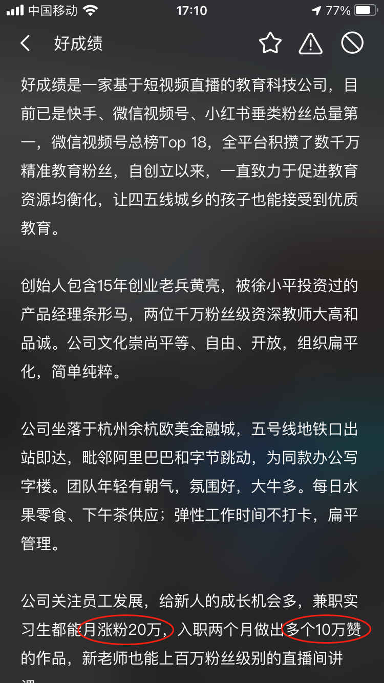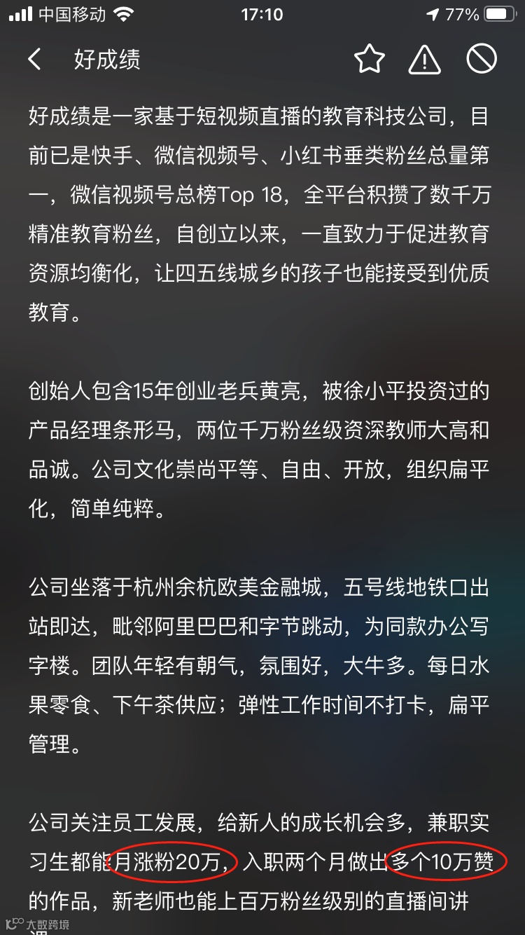 好成绩是一家基于短视频的中小学教育科技公司,目前已在快手、小红书英语类目做到粉丝总量第一,自创立以来,一直致力于促进教育资源均衡化,让四五线城乡的孩子也能接受到优质教育。联合创始人包含资深海归英语老师,创业者老司机,曾被徐小平投资看好的产品经理等。公司坐落于杭州乐富海邦园,地铁口交通便捷,工作氛围融洽平等,愿给每一位员工、实习生充足的成长机会和体面的薪酬,尤其适合有志于在教育、短视频行业干出一番事业的人来加入我们。(来源天眼查)