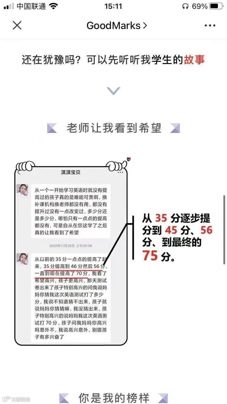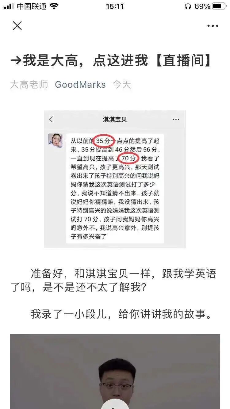 链接页面不仅仅是课程的介绍和资料内容,而是首先放置学生成功提分案例,再放大高老师的自白视频(同案例1),再放置学生家长好评反馈,最后放置微信号,一步步增强用户意愿度、信任感,可复用。