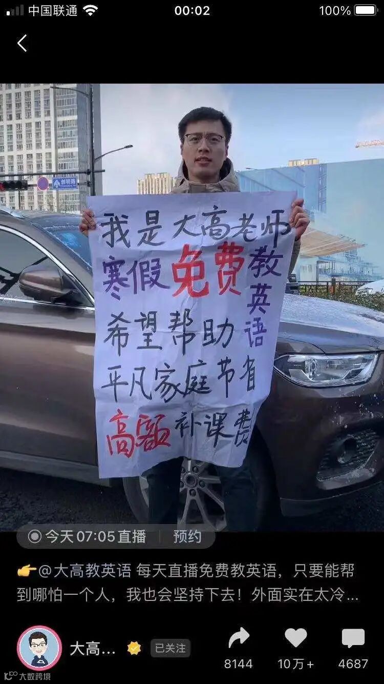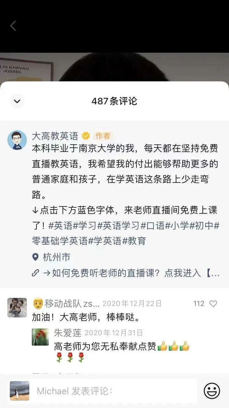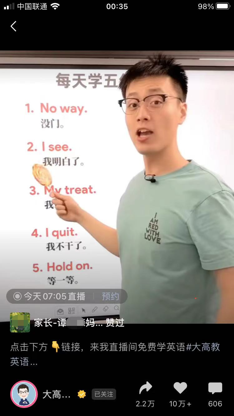 “本科毕业于南京大学的我,每天都在坚持免费直播教英语,我希望我的付出能够帮助更多的普通家庭和孩子,在学英语这条路上少走弯路”
