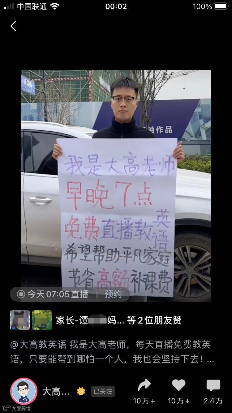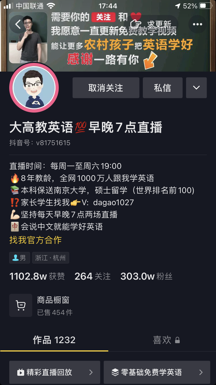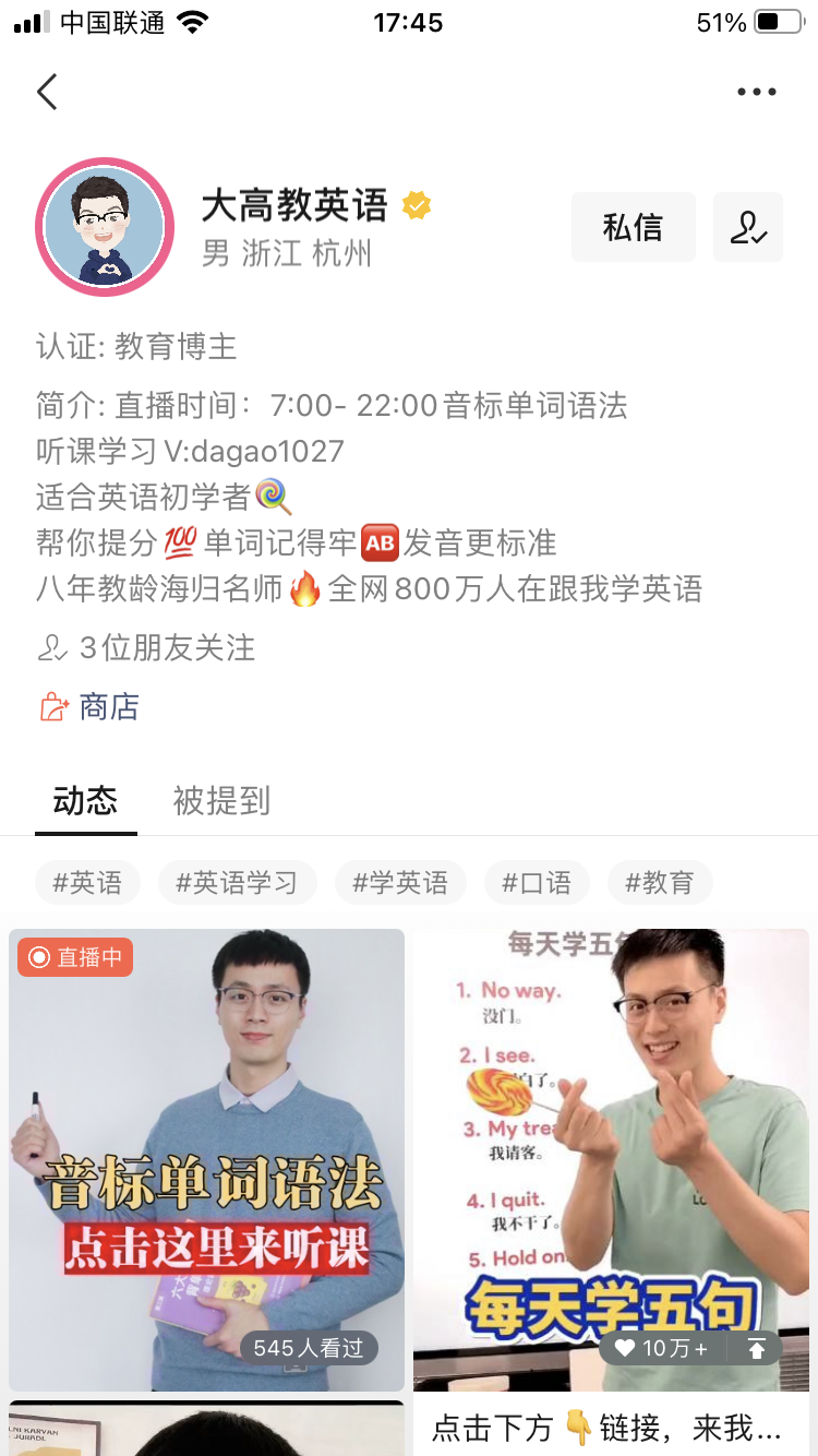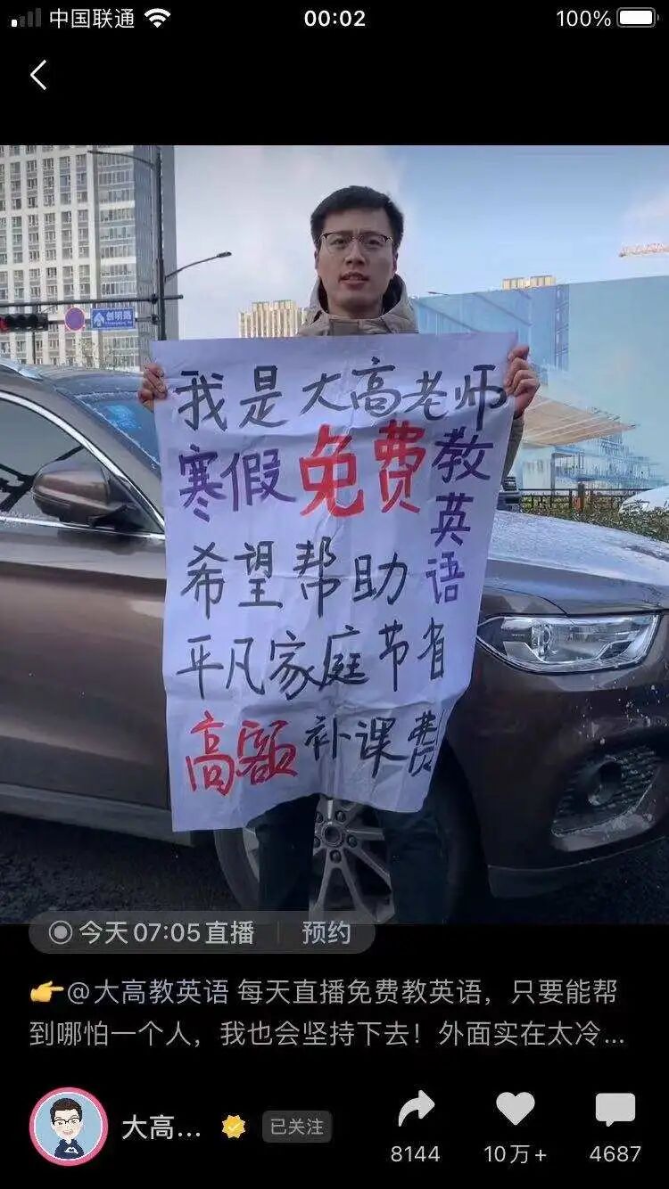 “本科毕业于南京大学的我,每天都在坚持免费直播教英语,我希望我的付出能够帮助更多的普通家庭和孩子,在学英语这条路上少走弯路”