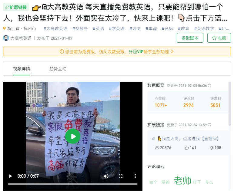 博主本人在寒冷的冬天在户外呼吁“寒假免费教英语,希望帮助平凡家庭节省高额补课费”,典型的从用户思维出发做内容,高额的补课费是大部分家长们的痛点之一,以此话题体现与其他机构教师的差异化,引流到直播间。
