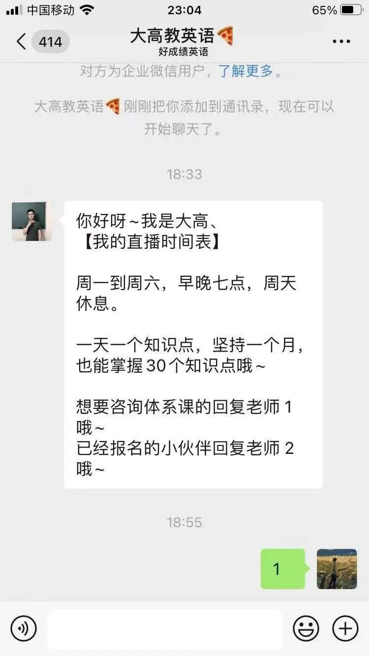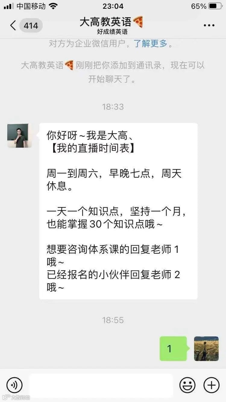 3.加了微信后回复很慢(到现在我还没收到具体的课程体系- -),考虑到人工成本,建议增加机器人回复告知链接和免费课领取方式。