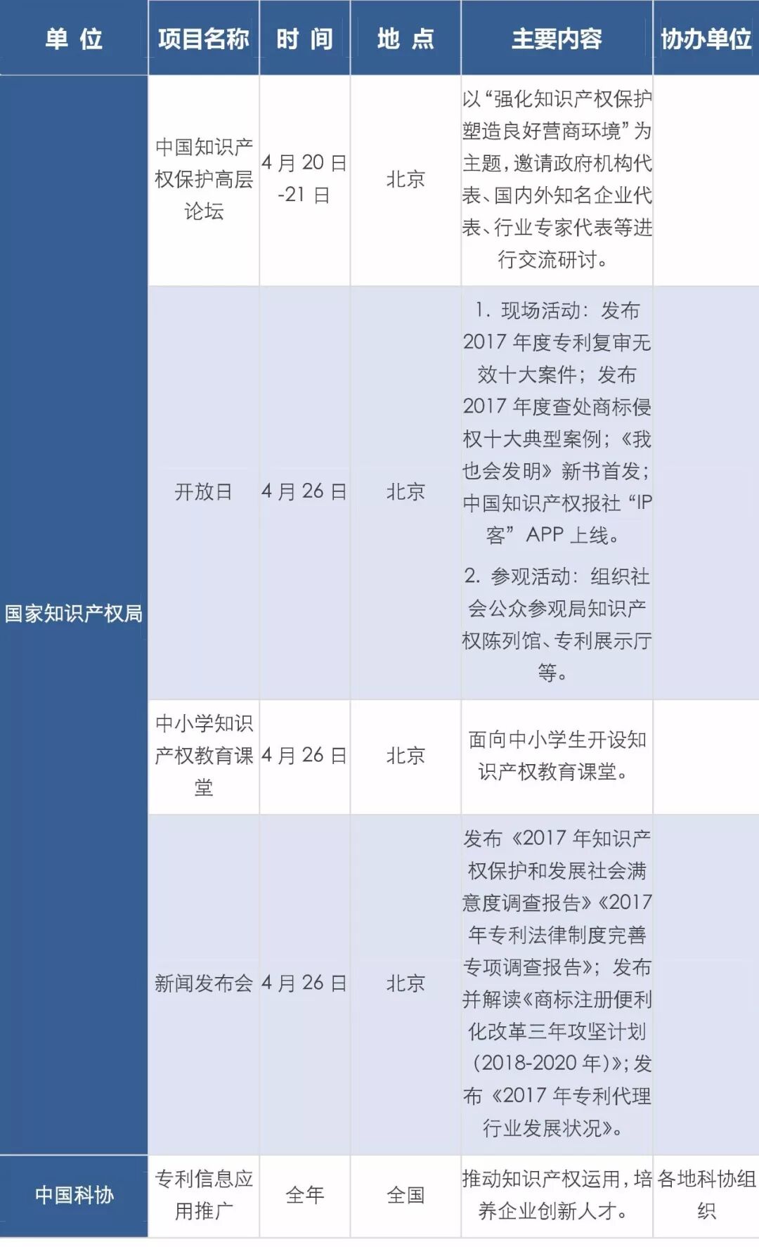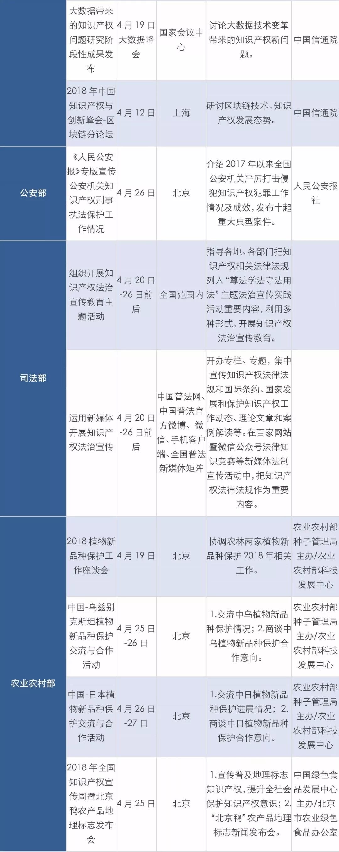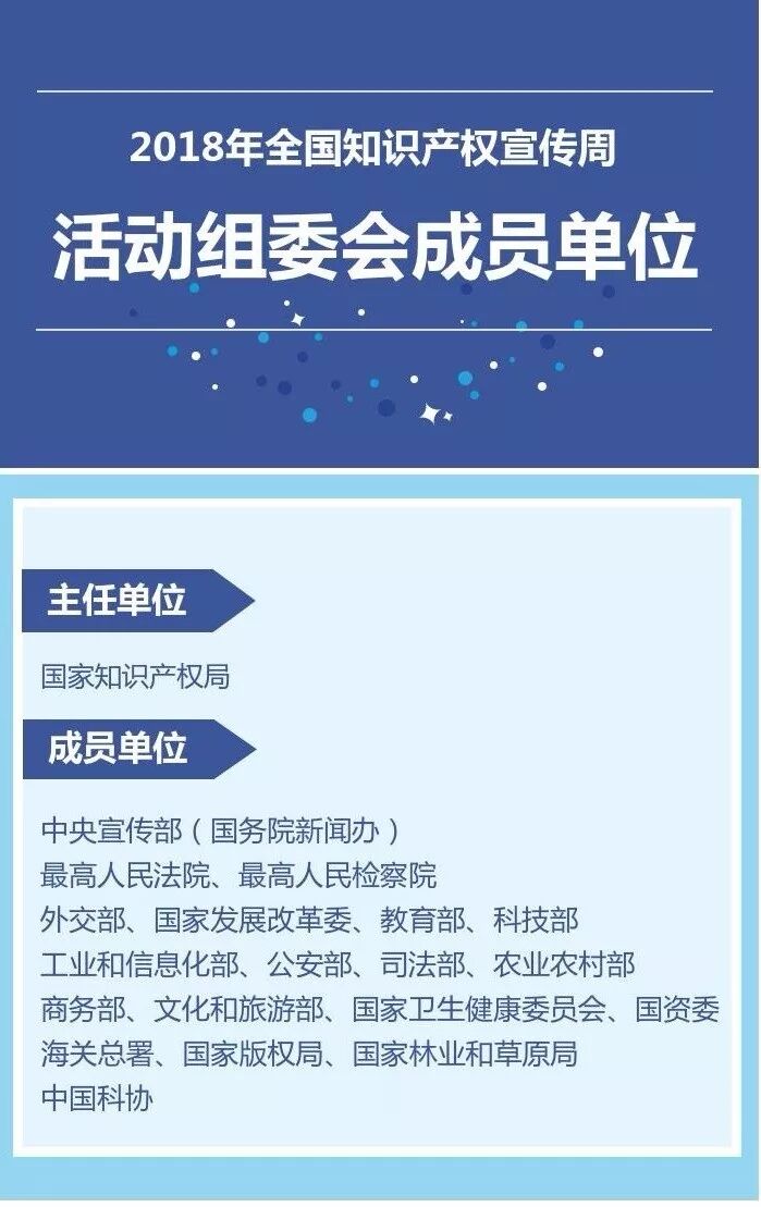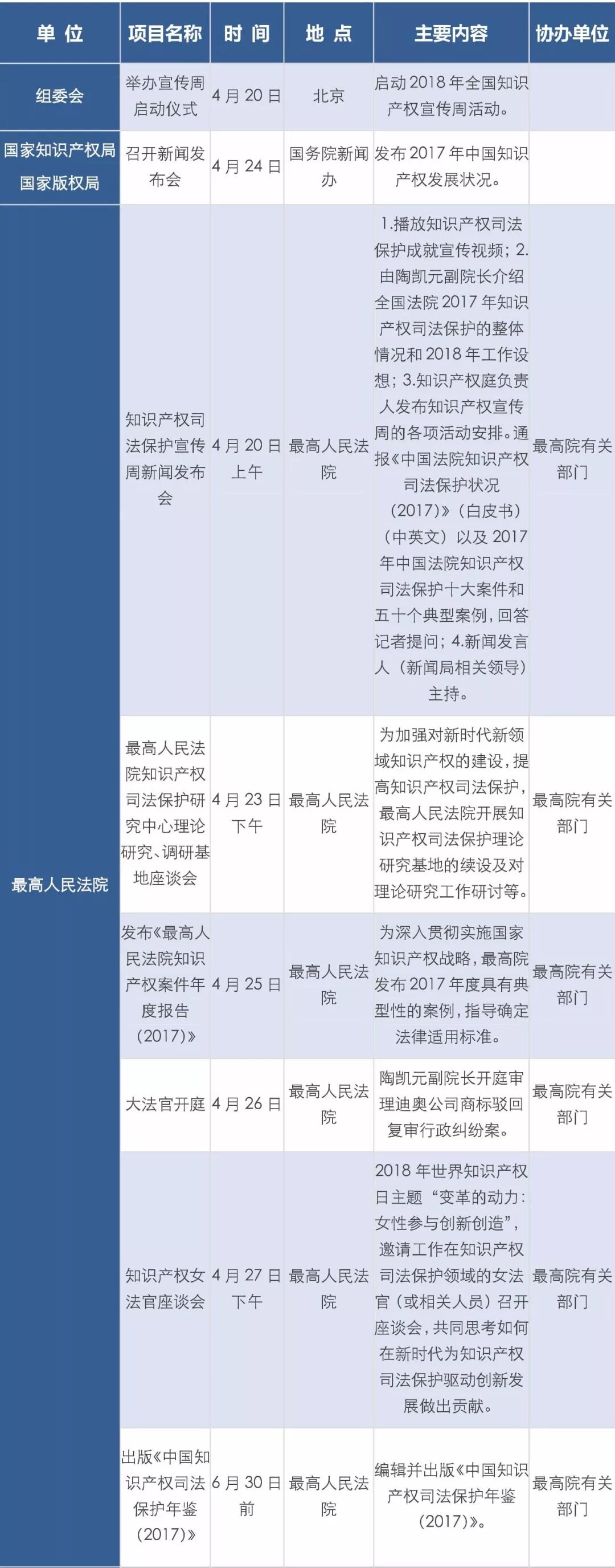 在启动仪式上,全国知识产权宣传周活动组委会主任、国家知识产权局局长申长雨介绍了宣传周活动期间的主要安排。据了解,宣传周活动期间,全国知识产权宣传周活动组委会各成员单位将单独或者多部门联合开展多场重点活动,其中包括,国家知识产权局和国家版权局在国务院新闻办公室联合召开中国知识产权发展状况新闻发布会,最高人民法院发布《中国法院知识产权司法保护状况(2017)》(白皮书),最高人民检察院将发布2017年度全国检察机关保护知识产权十大典型案例,司法部将在全国范围内组织开展知识产权法治宣传教育主题活动,农业农村部将分别组织召开中国-乌兹别克斯坦、中国-日本植物新品种保护交流与合作活动等。