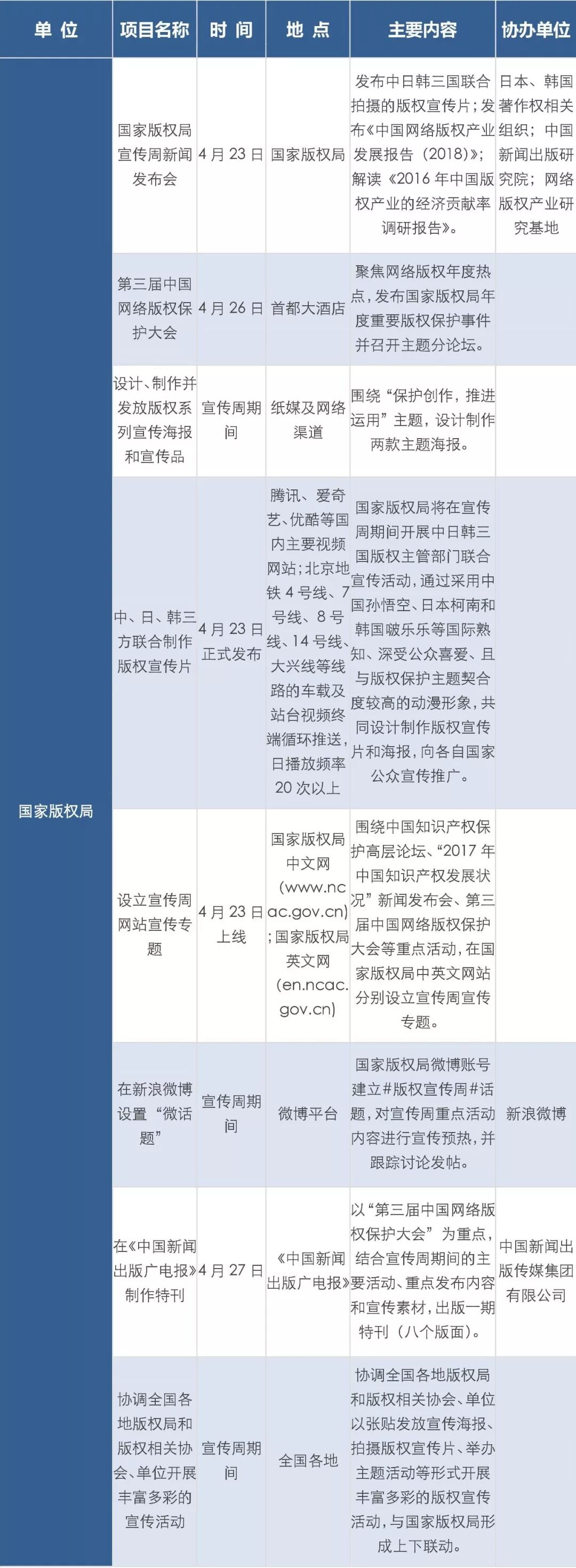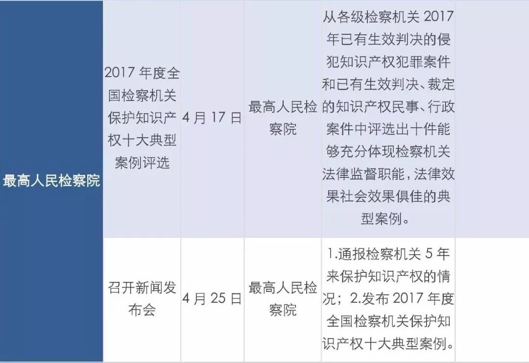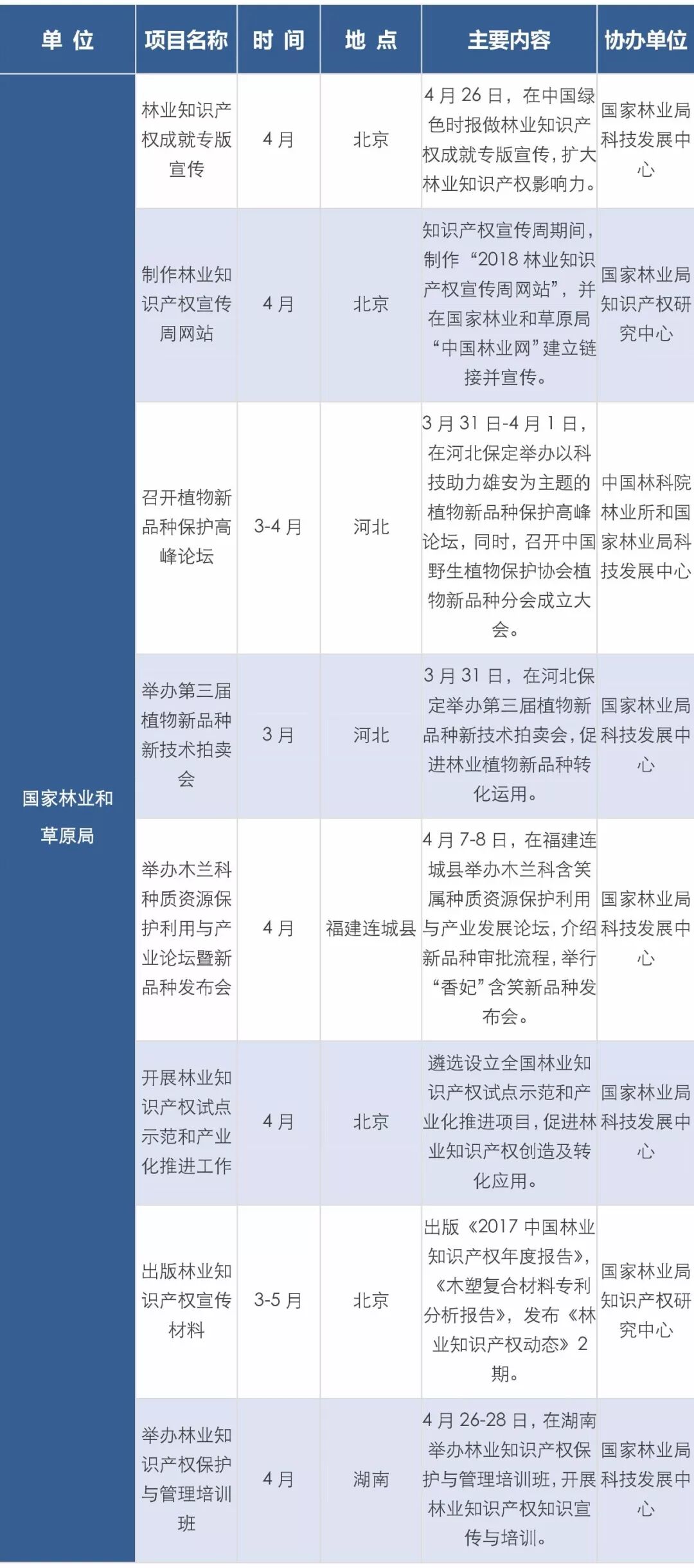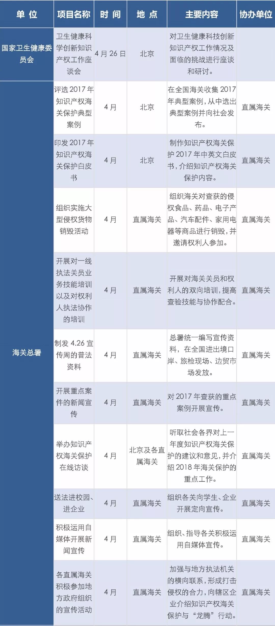 在启动仪式上,全国知识产权宣传周活动组委会主任、国家知识产权局局长申长雨介绍了宣传周活动期间的主要安排。据了解,宣传周活动期间,全国知识产权宣传周活动组委会各成员单位将单独或者多部门联合开展多场重点活动,其中包括,国家知识产权局和国家版权局在国务院新闻办公室联合召开中国知识产权发展状况新闻发布会,最高人民法院发布《中国法院知识产权司法保护状况(2017)》(白皮书),最高人民检察院将发布2017年度全国检察机关保护知识产权十大典型案例,司法部将在全国范围内组织开展知识产权法治宣传教育主题活动,农业农村部将分别组织召开中国-乌兹别克斯坦、中国-日本植物新品种保护交流与合作活动等。