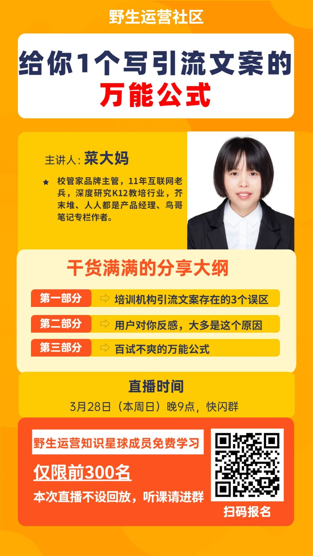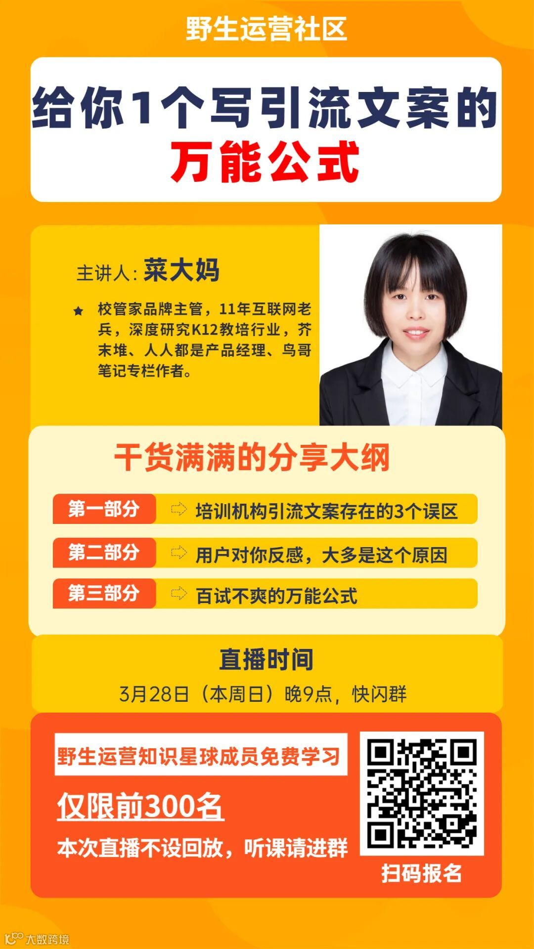 明明活动创意很好,但banner打开率很低;明明活动流程很顺,但宣传海报打开率很低;明明是个很好的老带新活动,但老用户就是“不吃这一套”……本周日晚9点,我邀请了校管家品牌主管菜大妈和你分享《1个写引流文案的万能公式》,希望对头秃文案的你有所帮助。