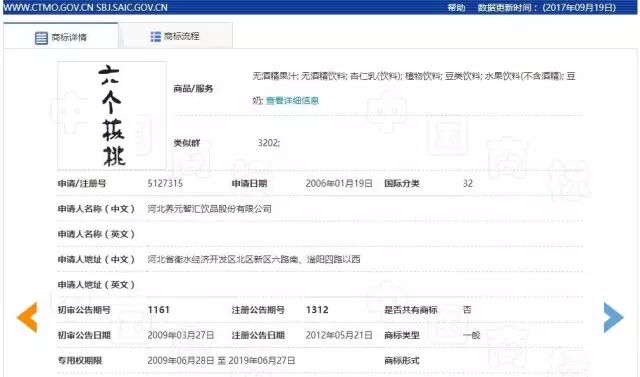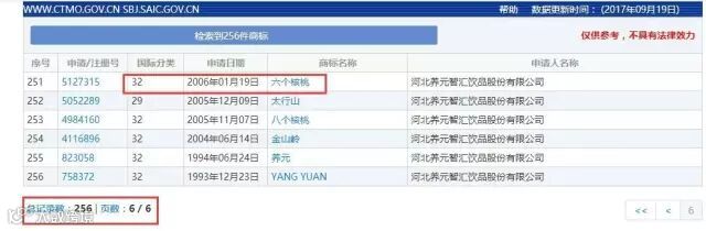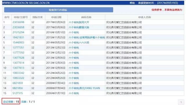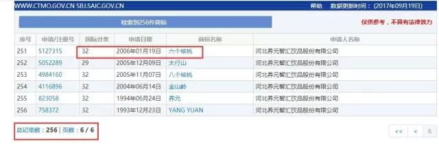 据中国商标网显示,养元智汇公司共申请有256件商标,注册“六个核桃”32类商标最早申请是在2006年1月19日,注册成功是在2009年6月28日,共计注册15件“六个核桃”字样为主的32类商标。