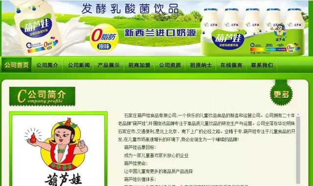 笔者在网络上未查询出石家庄葫芦娃食品有限公司的官网信息,但是在中起食品饮料招商网上找到了相对比较详细的介绍资料。资料显示石家庄葫芦娃食品有限公司是一个快乐的儿童饮品食品的制造和运营公司。公司拥有二十年老品牌“葫芦娃”,并围绕该品牌专注于高品质儿童饮品的研发生产与运营。公司坐落在华北明珠石家庄市,交通便利,是北上北京、南下上广的必经之路。葫芦娃专注于儿童食品的开发。