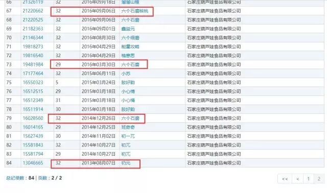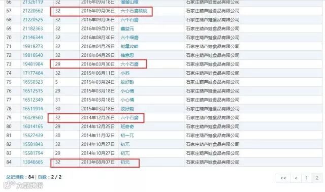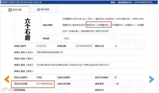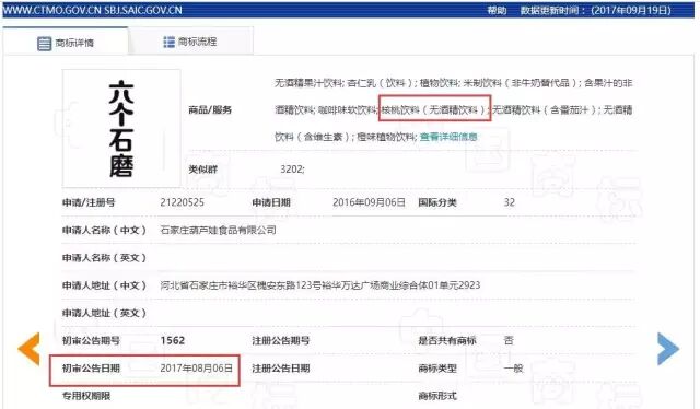 1、石家庄葫芦娃食品有限公司早于2014年12月26日,就在32类的3201不含酒精饮料相关产品上申请“六个石磨”商标,并于2016年3月7日注册成功;之后,还于2016年9月6日申请“六个石磨核桃”商标,这个商标保护看起来好像也是稳扎稳打。