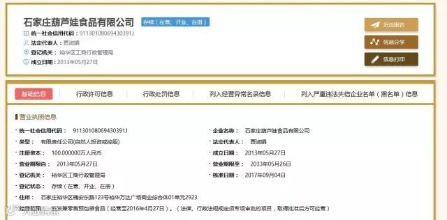 笔者通过石家庄葫芦娃食品有限公司商标档案发现,石家庄葫芦娃食品有限公司从公司成立开始就开始申请商标保护。石家庄葫芦娃食品有限公司于2013年5月27日成立,而第一个商标是在2013年8月7日开始申请。这商标保护意识还真是挺强的。