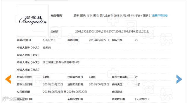 1、争议商标由被申请人于2015年4月27日向商标局提出注册申请,于2016年6月21日被核定使用在第25类服装、内衣等商品上,现为有效注册商标。