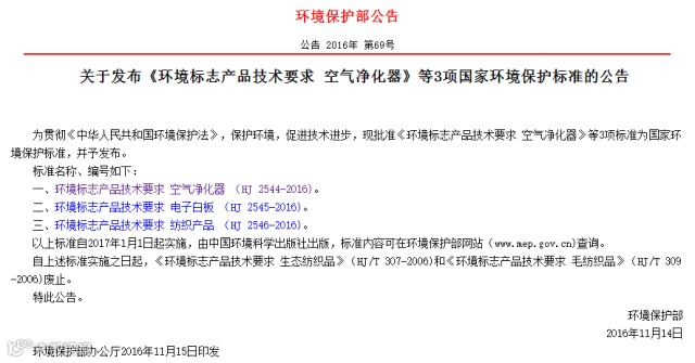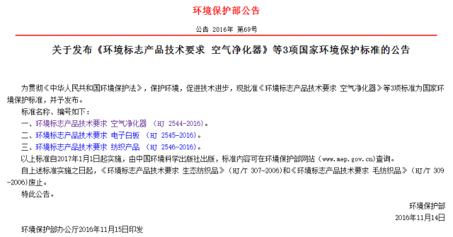 环保部环境发展中心13日在北京发布国内首个空气净化器中国环境标志标准:HJ 2544-2016 环境标志产品技术要求 空气净化器,旨在帮助消费者选择适合的空气净化器产品,促进和规范空气净化器市场的健康发展。该标准将于明年1月1日起实施。