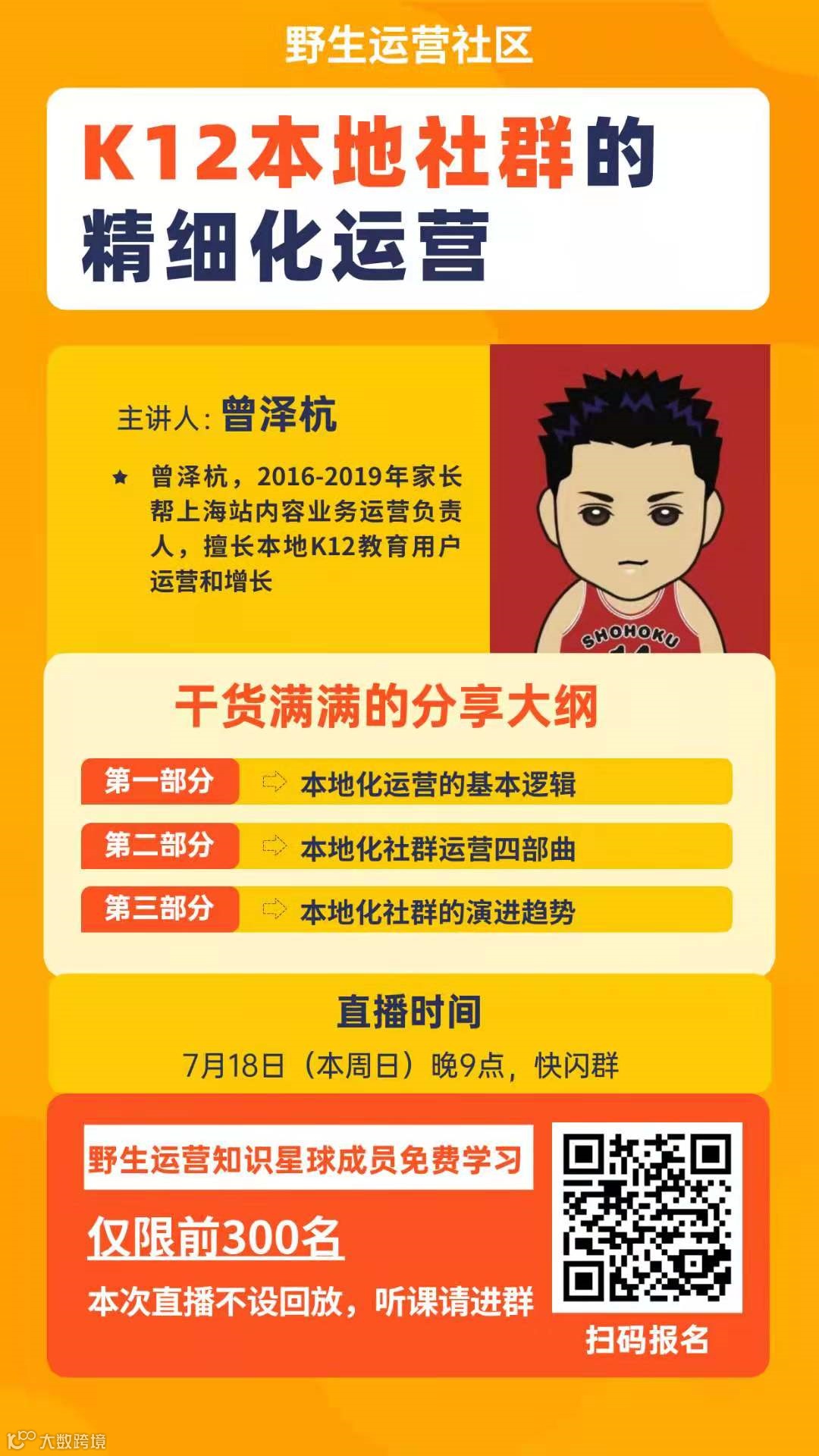 明晚9点,我邀请泽杭老师,2016-2019年家长帮上海站内容业务运营负责人,擅长本地K12教育用户运营和增长,带来分享《K12本地社群的精细化运营》本次分享不设回放,感兴趣的扫码报名啦,报名截止明晚8点。如果你觉得本次课程有价值,欢迎把海报分享给更多有需要的小伙伴哦,感谢❤