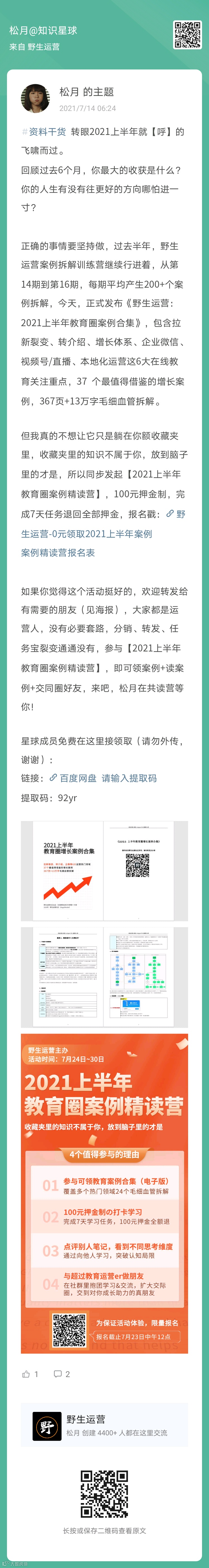 欢迎加入野生运营星球,每周一次快闪分享、教育圈一手资料、1V1答疑……等硬核干货,而且还能一次入手包括 《2020年教育圈增长案例合集》、3989 个在线教育圈案例合集全库、100+ 场群分享的音频+逐字稿、N多运营工具包和资料,就问你一句,值不值?