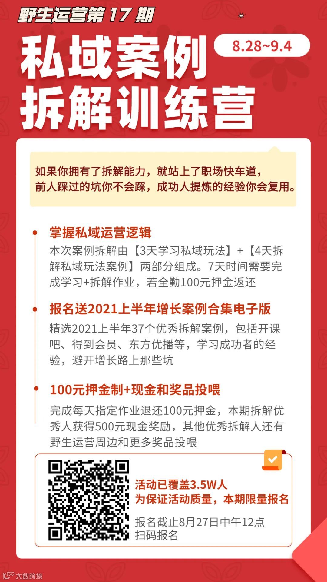 野生运营案例拆解训练营来了,这次升级为「私域案例拆解训练营」,本次为保证体验限量报名,扫码占座,一起进步: