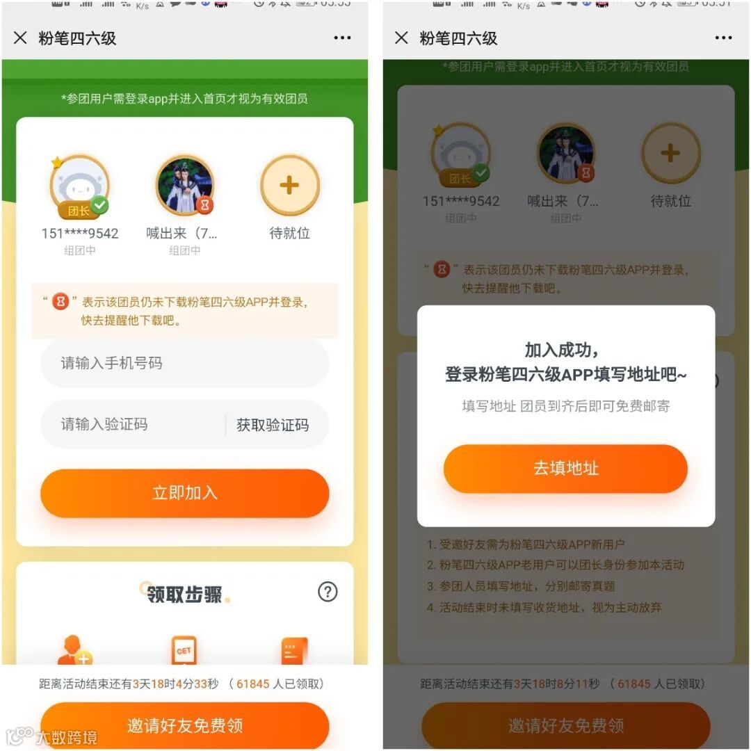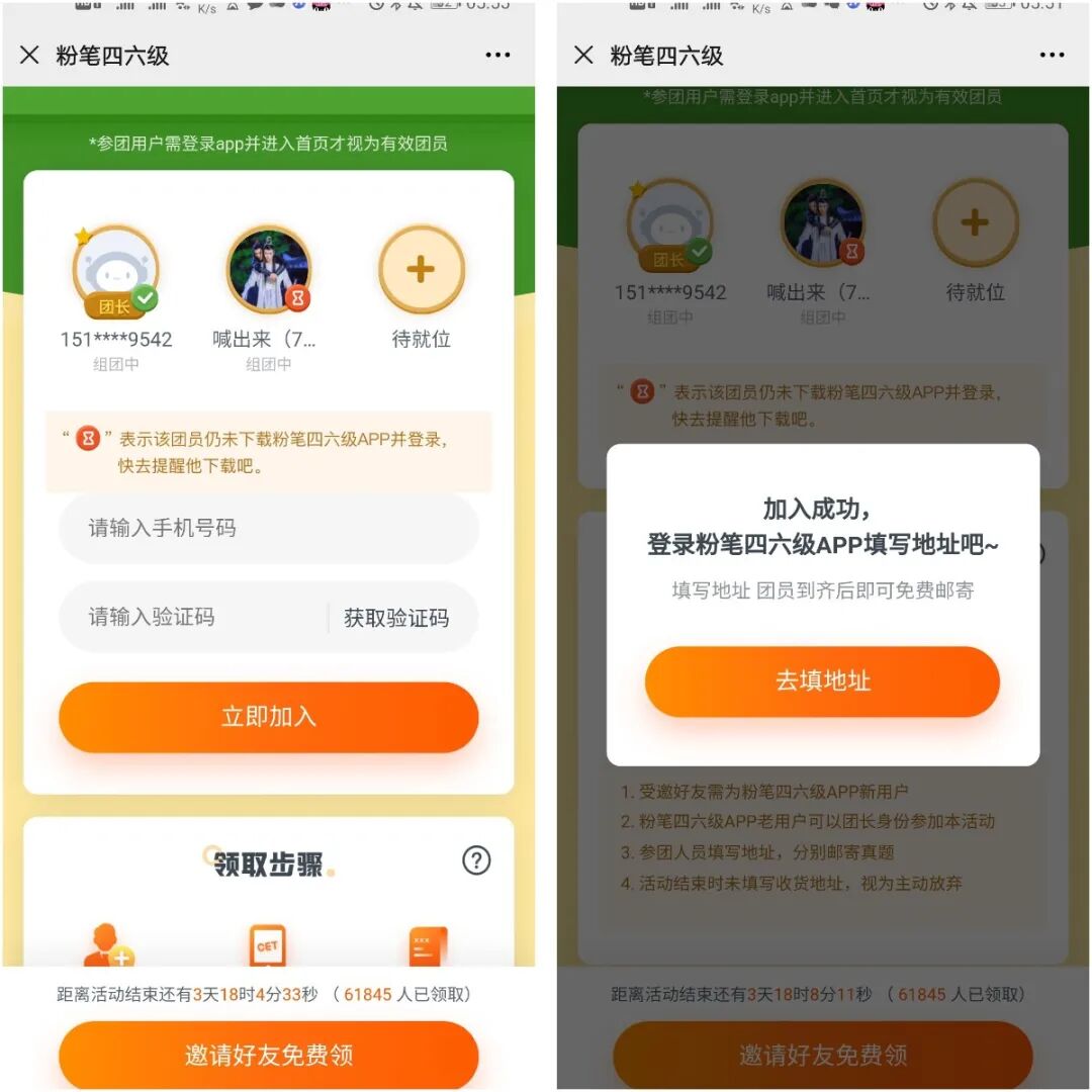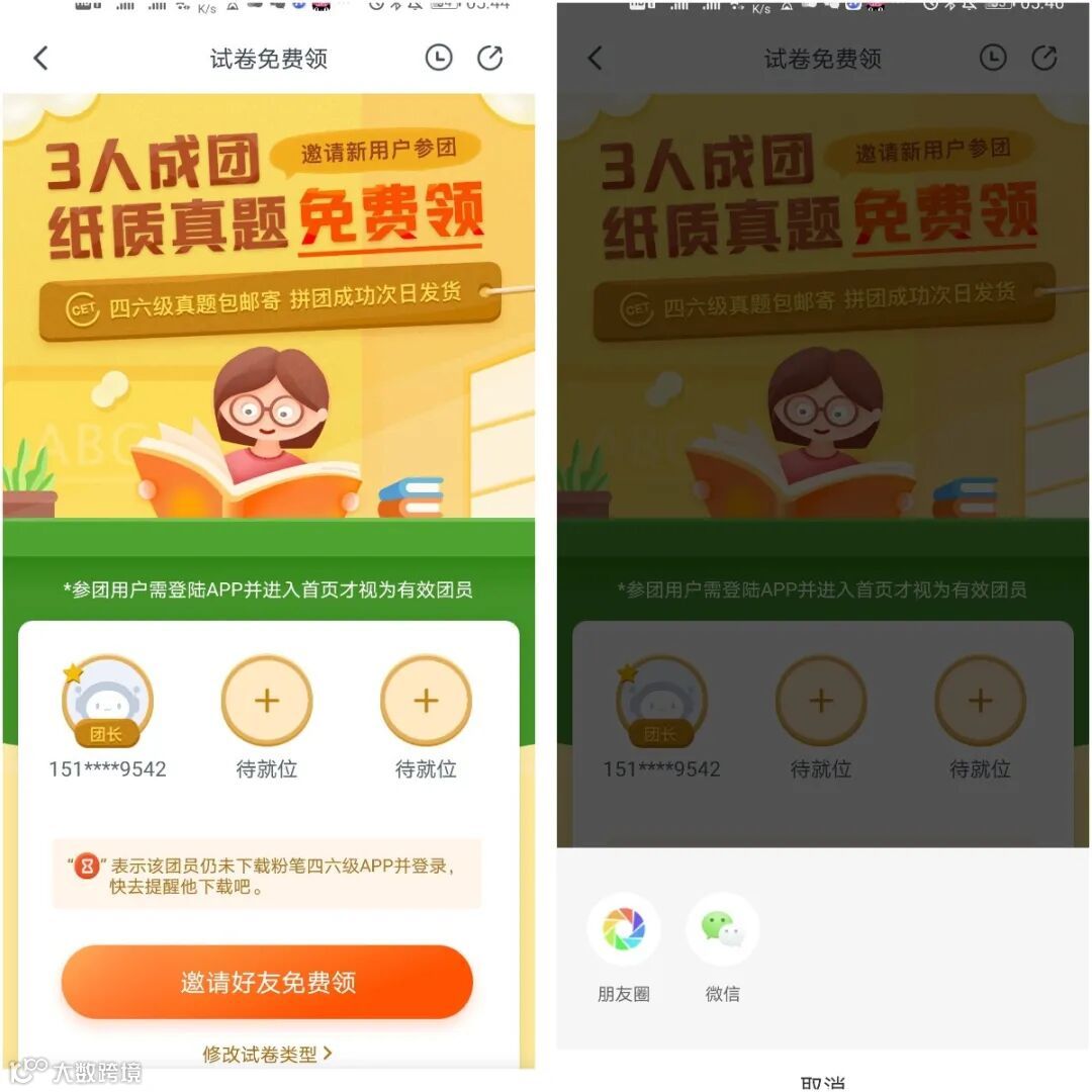 1.2、分享难度:3人成团即可领取的人数限制条件难度较低,但新加入成员均为新用户难度中等,毕竟大学生用同一款软件的情况较多。
