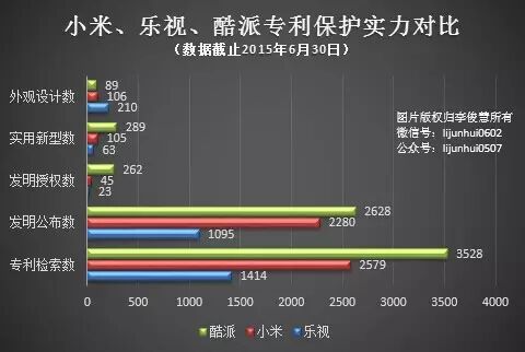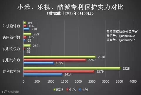 专利规模:酷派全面领先小米,小米多项指标强于乐视