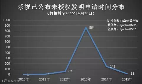 截止2015年6月30日,乐视已提交申请未授权的发明专利申请共计1095件,从提交申请的时间来看,大多数集中2013年,当年提交的申请占其已提交申请总量的79%。
