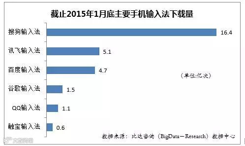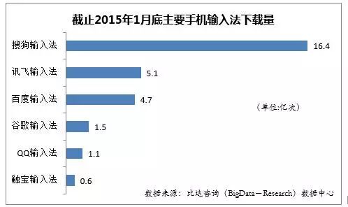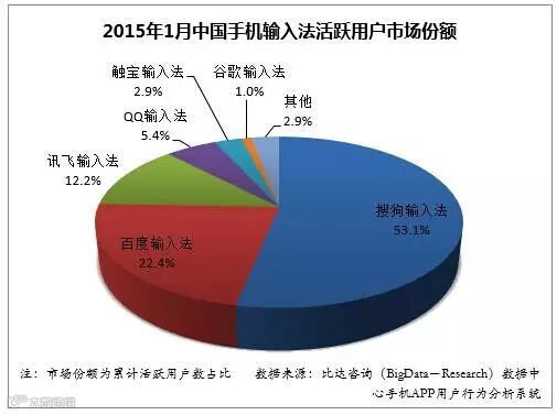 市场份额方面,据比达咨询 (BigData-Research) 数据中心数据显示,2015 年 1 月手机输入法活跃用户数占比中,搜狗输入法占据 53.1%的市场份额,位居行业第一,而百度输入法和讯飞输入法分居二、三位,市场份额分别为 22.4%和 12.2%。排在此后的依次为 QQ 输入法、触宝输入法和谷歌输入法等。(注:搜狗 Q2 财报公布的数据是,搜狗手机输入法月活跃用户数突破 1.5 亿,市场份额已超过 60%,稳居移动输入软件第一。)