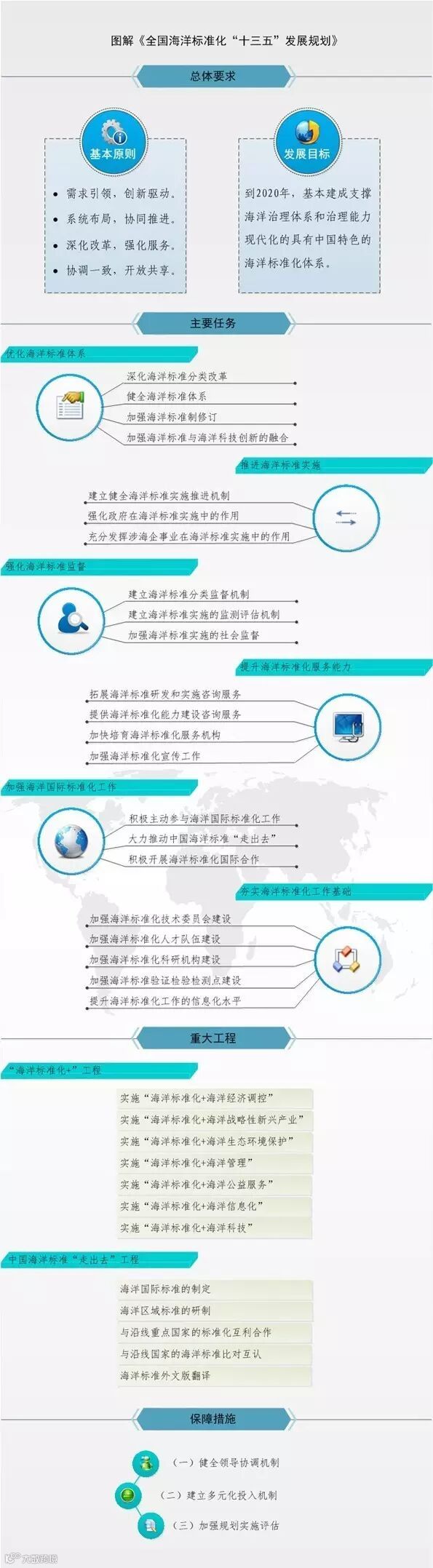 《规划》明确,“十三五”期间,我国将推动实施“海洋标准化+”工程和中国海洋标准“走出去”工程。“海洋标准化+”工程具体包括,“海洋标准化+海洋经济调控”“海洋标准化+海洋战略性新兴产业”“海洋标准化+海洋生态环境保护”“海洋标准化+海洋管理”“海洋标准化+海洋公益服务”“海洋标准化+海洋信息化”“海洋标准化+海洋科技”等;中国海洋标准“走出去”工程包括,海洋国际标准的制定、海洋区域标准的研制、与海上丝绸之路沿线重点国家的标准化互利合作和海洋标准比对互认、海洋标准的外文版翻译等。