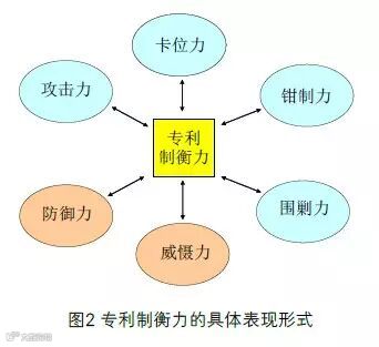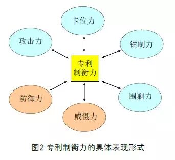 “专利制衡力”,指通过专利运营要产生的能制衡对手的专利力量。如图2,它体现在中国企业的专利组合能对竞争对手的技术、产品、市场及专利本身产生攻击、卡位、钳制、围剿和威慑作用,同时对自己的技术、产品或专利产生防御保护。