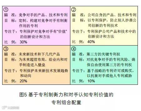 图5则显示了中国企业基于专利制衡力和对手认知专利价值的专利组合,图中的比例仅为示意的,企业可以根据自身的商业战略和专利战略作调整。