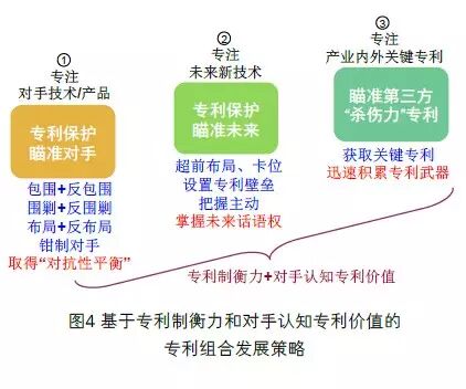 要取得“专利制衡力”和“对手认知专利价值”,中国企业可采用如图4所示的专利组合发展策略,其分为三部分重点。