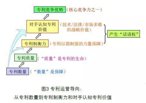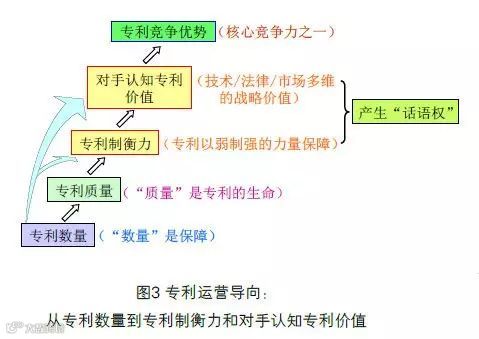 与传统专利运营模式相比, 该种专利运营的导向也发生显著变化(如图3):从之前只重视专利数量、专利质量变成更加重视发展专利制衡力和产生对手认知专利价值。