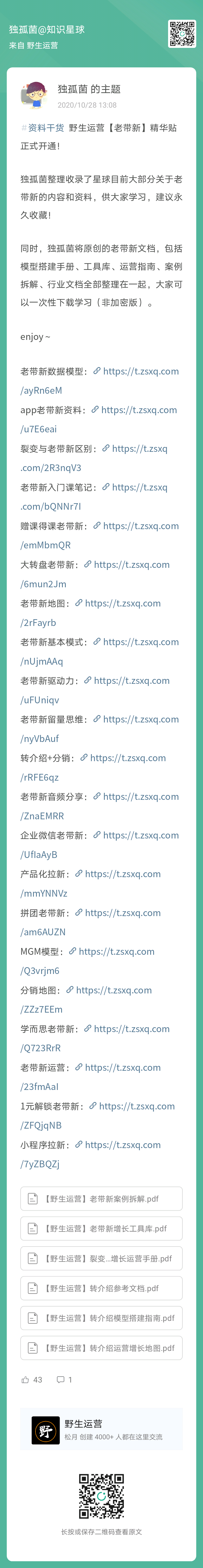 欢迎加入野生运营星球,每周一次快闪分享、教育圈一手资料、1V1答疑……等硬核干货,而且还能一次入手包括 《2020年教育圈增长案例合集》、3736 个在线教育圈案例合集全库、70 页下沉市场观察合集、100+ 场群分享的音频+逐字稿、N多运营工具包和资料,就问你一句,值不值?