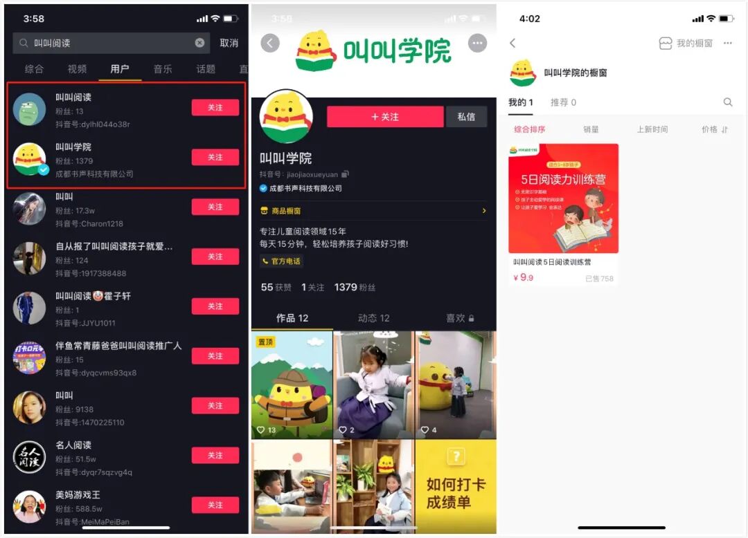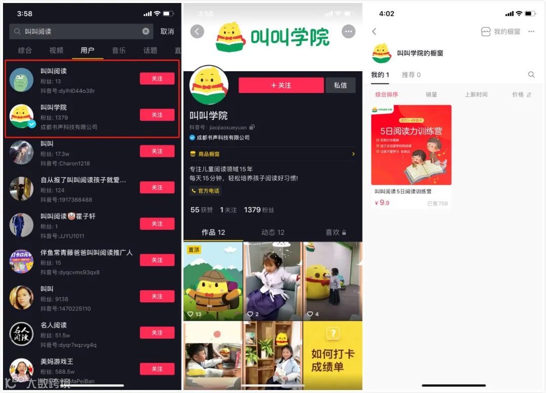 抖音:2个官方账号+部分老师账号,【叫叫学院】第一个视频是10月15日才开始发的。