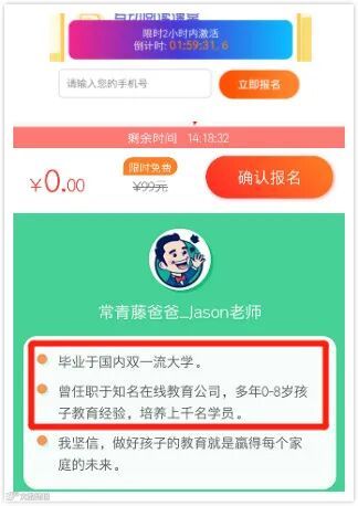 第一印象注意力:首屏展现0元免费字眼,让用户第一眼就知道这是免费课。