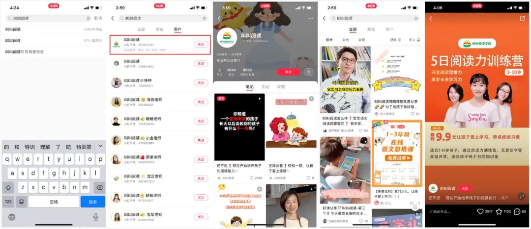 小红书:1个官方账号,同抖音主推9.9元5日阅读力训练营,以及KOL推广&真实家长,n个老师号。