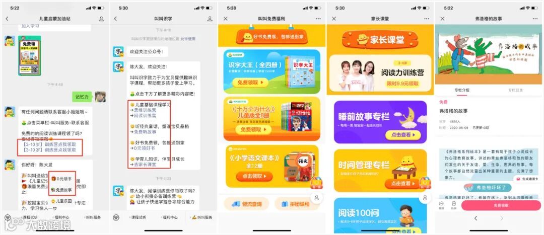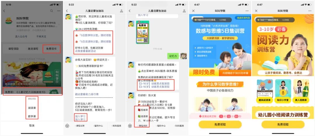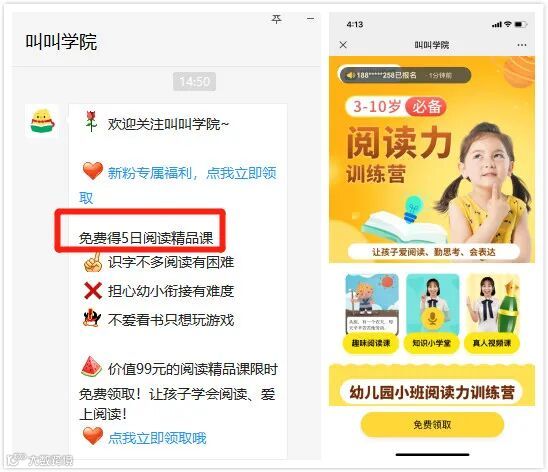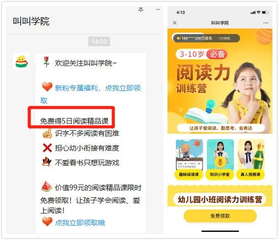 营销漏斗相关性,主要是保持页面和潜在客户认为他们看到落地页的相关性;而在叫叫阅读的公众号菜单栏、新好友应答、抖音小红书投放广告上,都有明确说明是5天阅读力训练营,和落地页内容前后一致。
