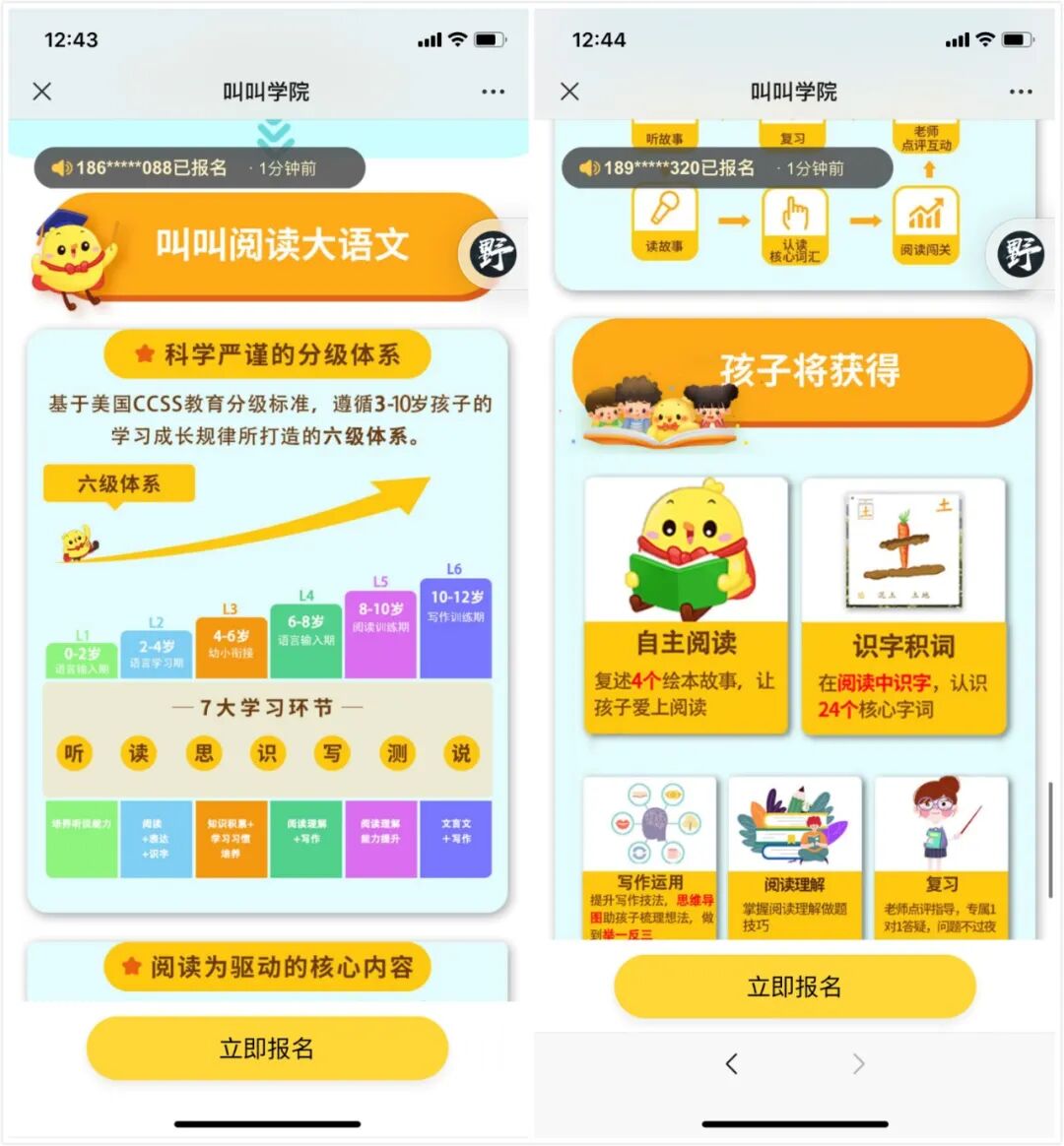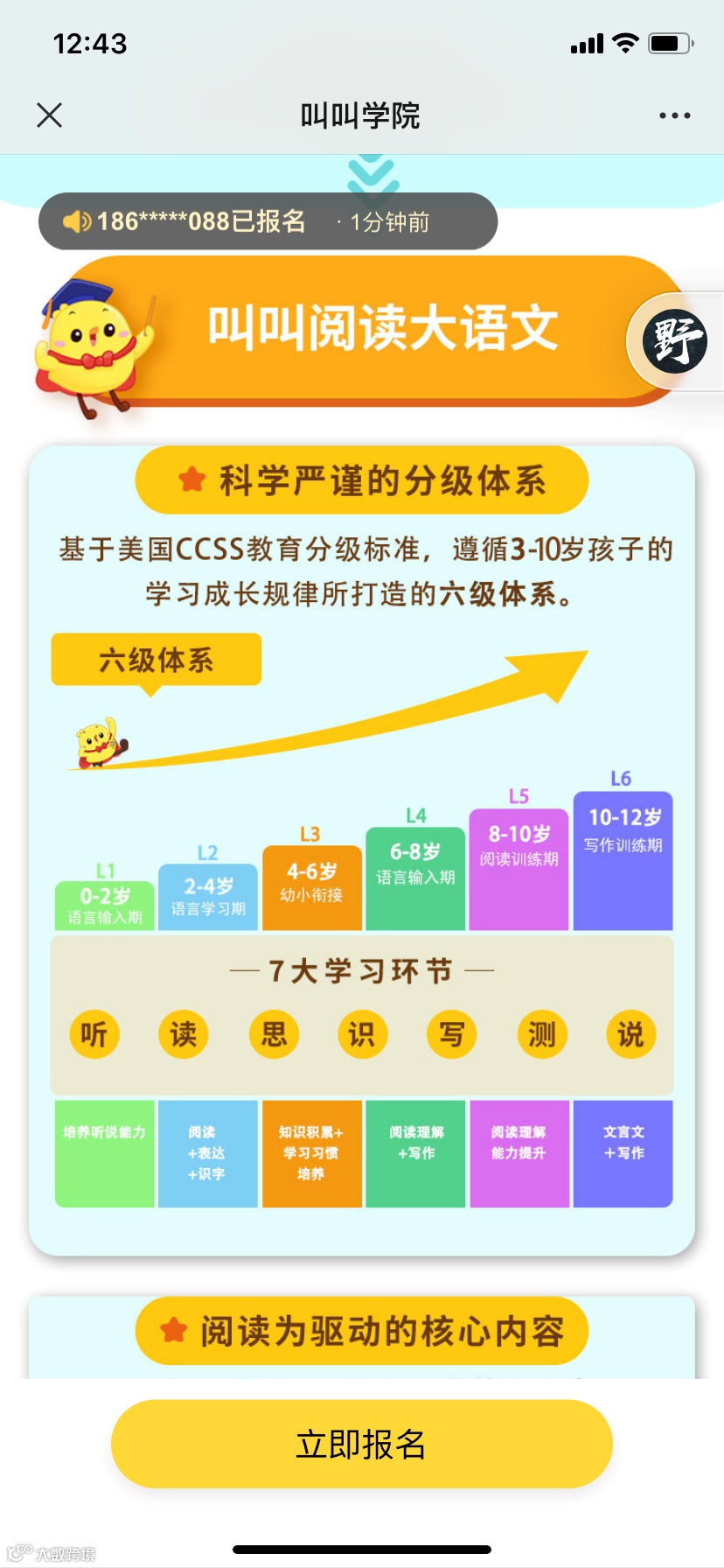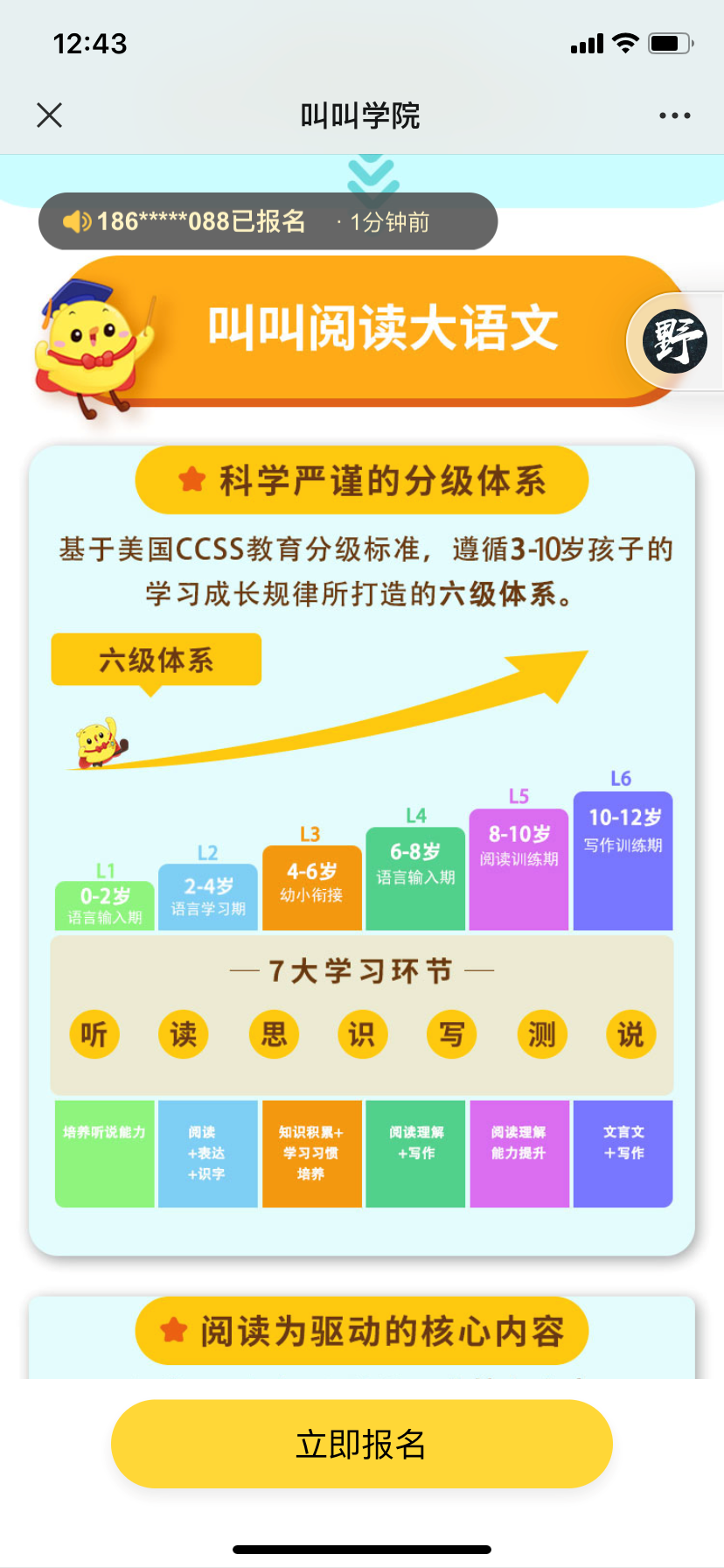 末尾“关于叫叫阅读学院”,占的板块很小,扩大一些版面,因为是展示叫叫阅读的成就的,更应该突出展示,让用户有信任感