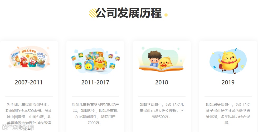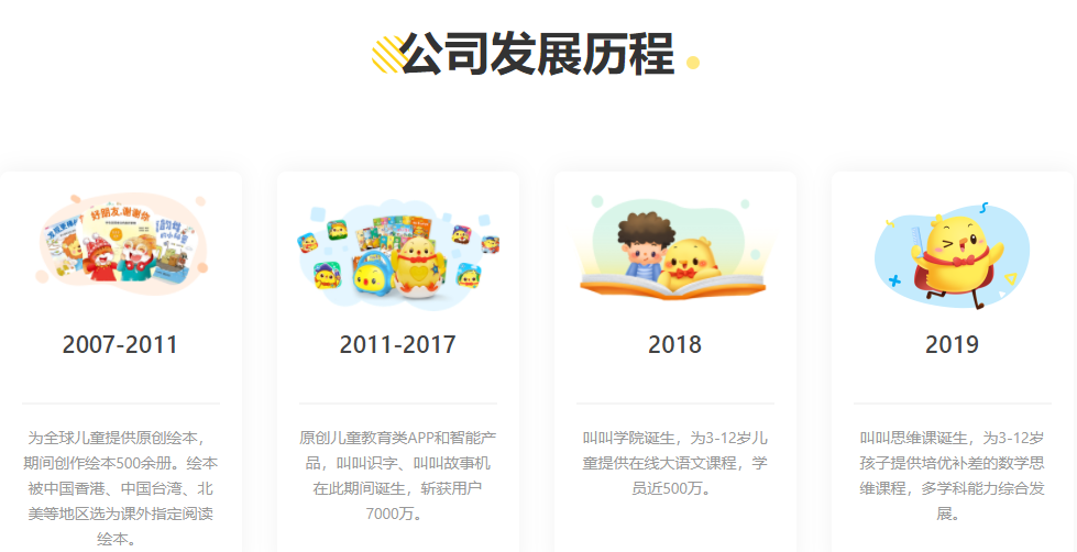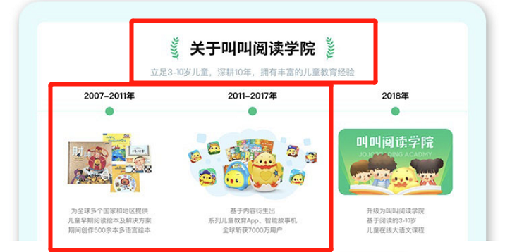 叫叫阅读成立于2007年,旗下『叫叫识字』APP在儿童教育榜上排名前列,拥有一批儿童精准流量,线上获客效率较高;2014年月活用户达到300万;2017年『叫叫阅读』诞生前,『叫叫系app』全球下载总量达5000万次,累积用户达7000万