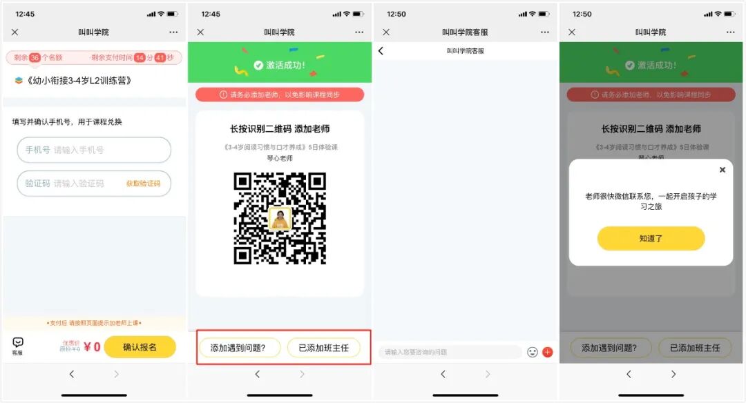 ③“已添加班主任”按钮:也提示老师会很快联系,让用户安心,而不是感觉留了个人信息,但是没有老师联系的不安全感。