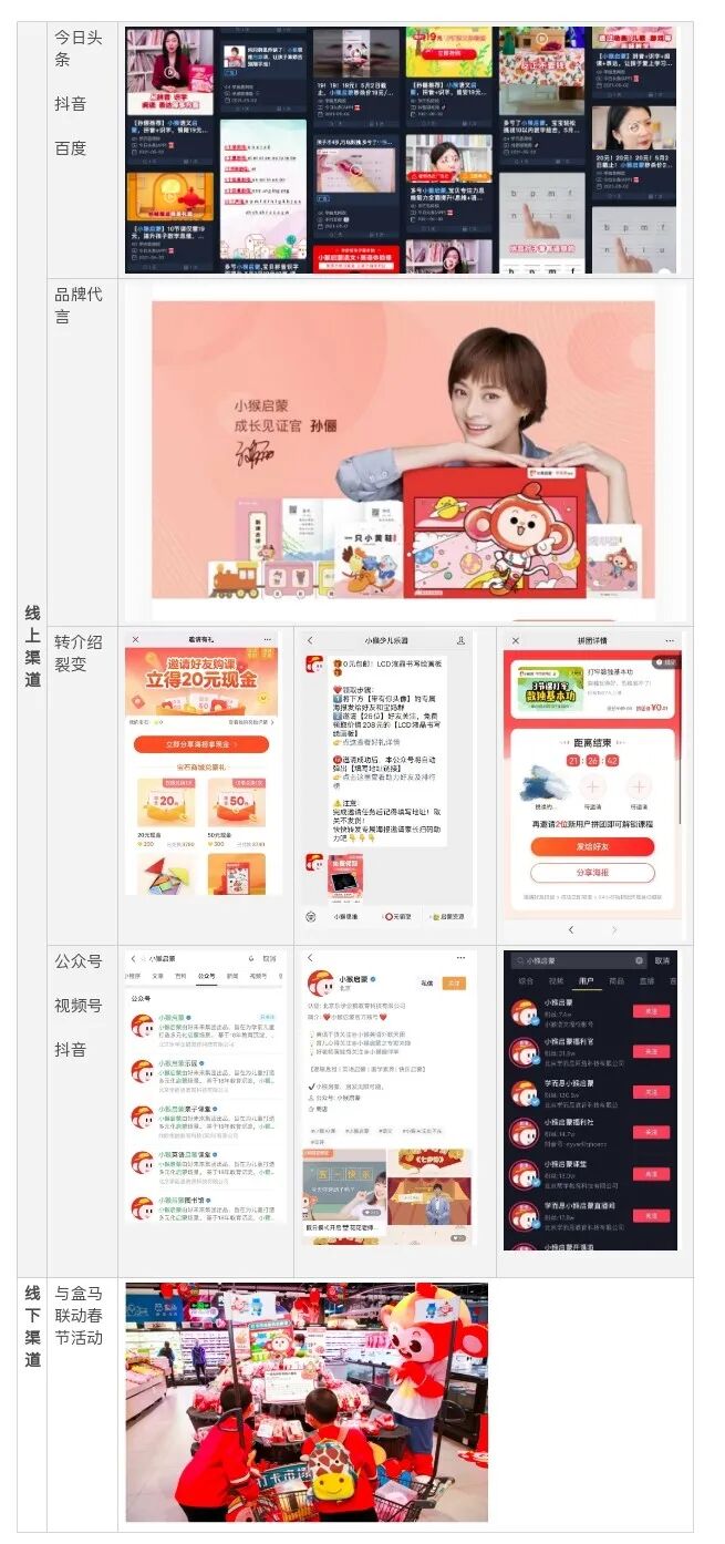 小猴AI本身属于学而思产品,暂时未查到其他学而思产品向小猴导流(可能目标用户年龄不同)猜测之后小猴反而会向其他产品导流,其外部投放引流渠道多样,线下盒马联动活动很有特色(鼓励孩子在生活中学知识)、转介绍裂变活动也多线并行,总体引流路径还是很多样的