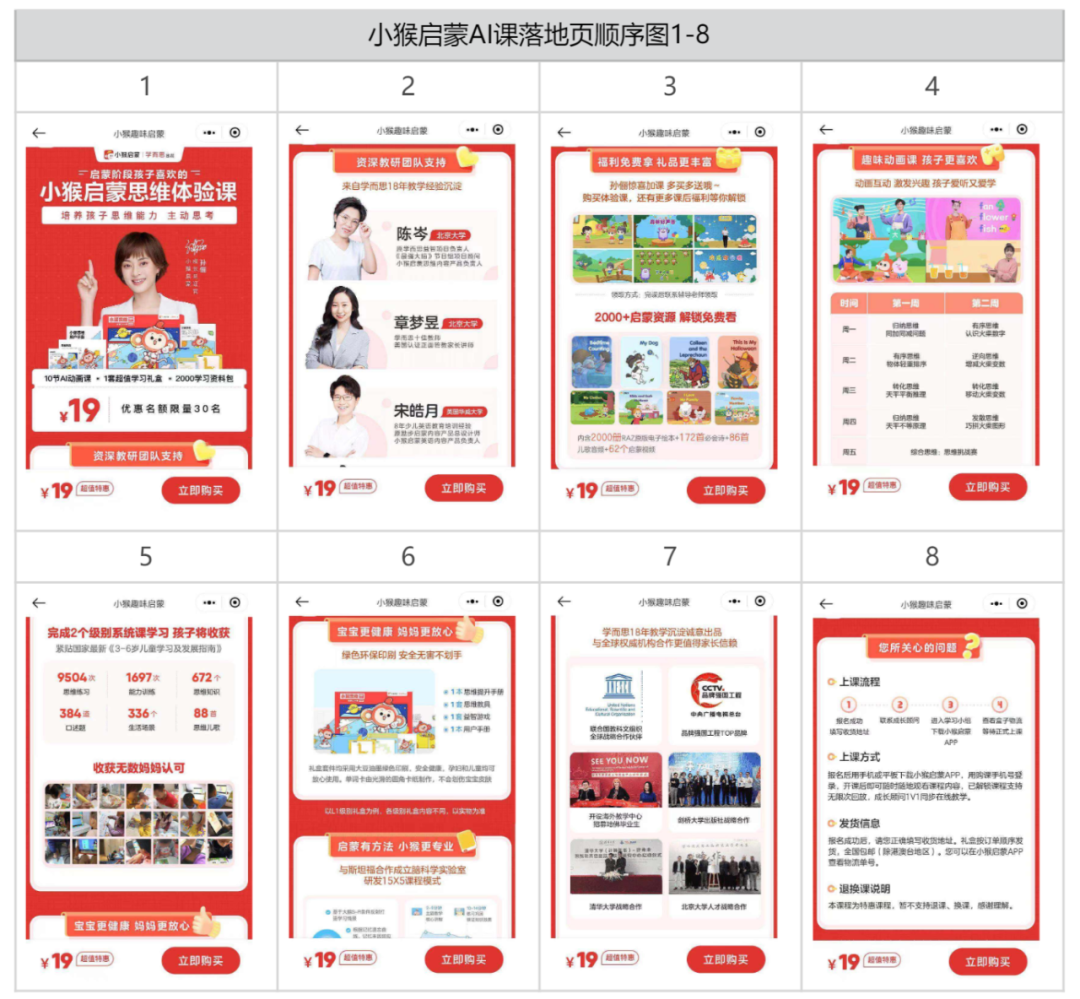3门不同学科体验课扫码进入的落地页内容是完全一样的,海报排版、色调几乎一样(仅有文案略改),此次拆解以思维课进入的落地页,如顺序图1-8所示