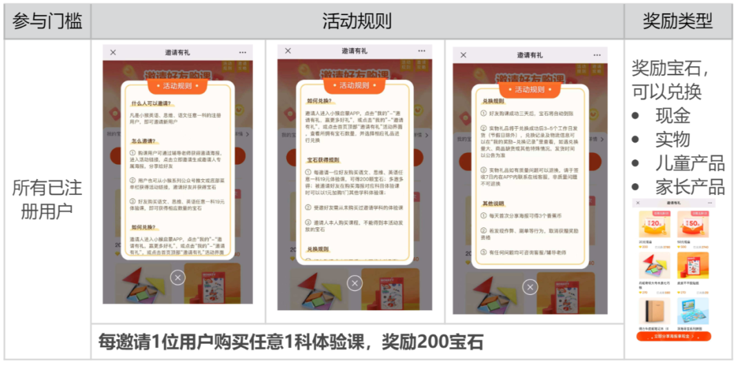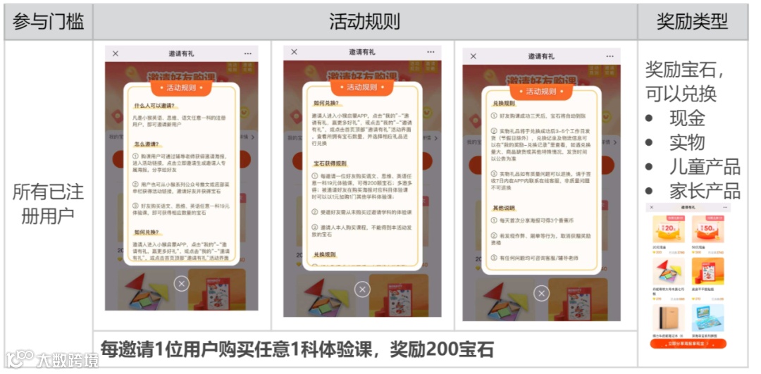 1)物质需求:邀请成功后获得的“宝石”可以到商城进行兑换,礼品包括现金、学习用品、家庭用品,对家长有一定吸引力