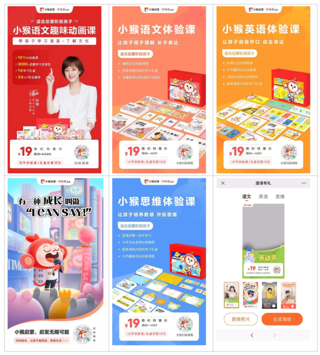 此外,小猴的海报一共有10种(9份已定制+1份自定义),配色舒适,和品牌色匹配,其中“自定义”又有4个模版套用,总体上给用户的选择多样化,也可以测试出不同海报类型的效果,为之后海报迭代提供数据支持。相关海报如图3所示