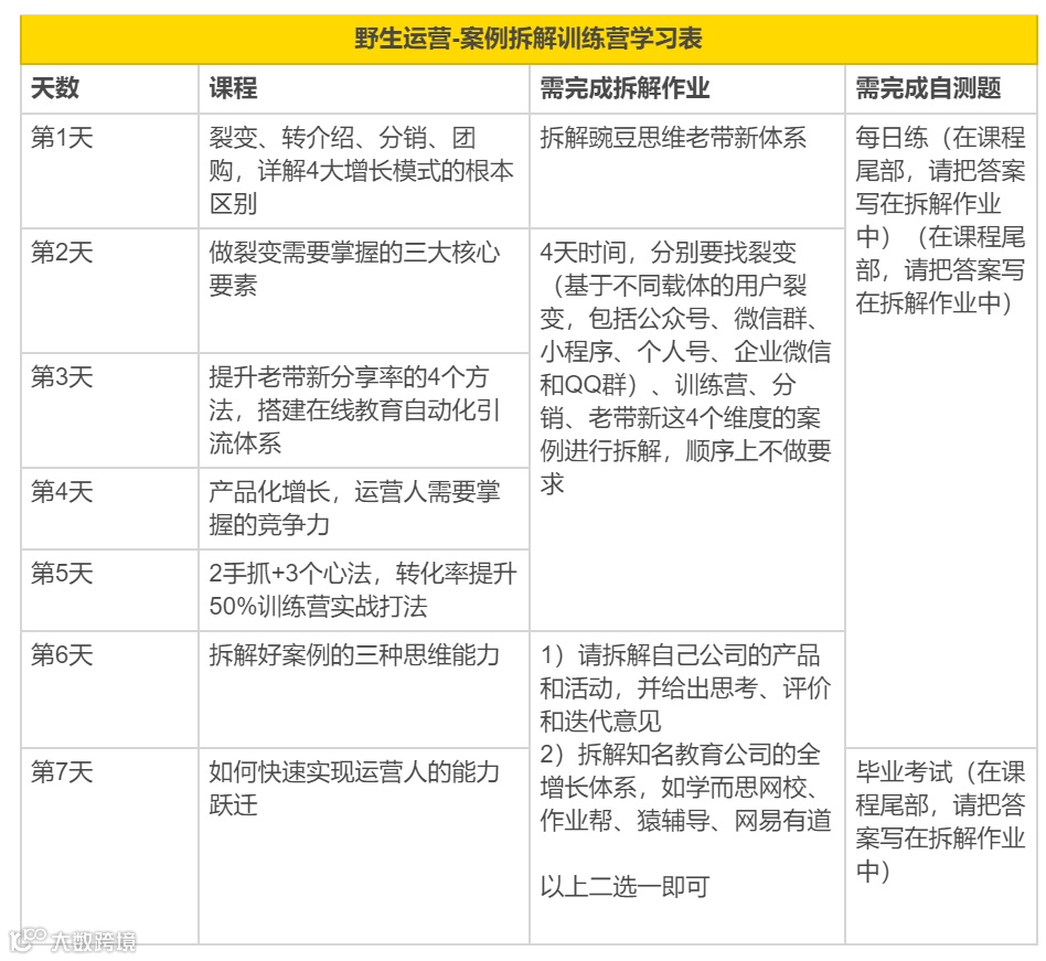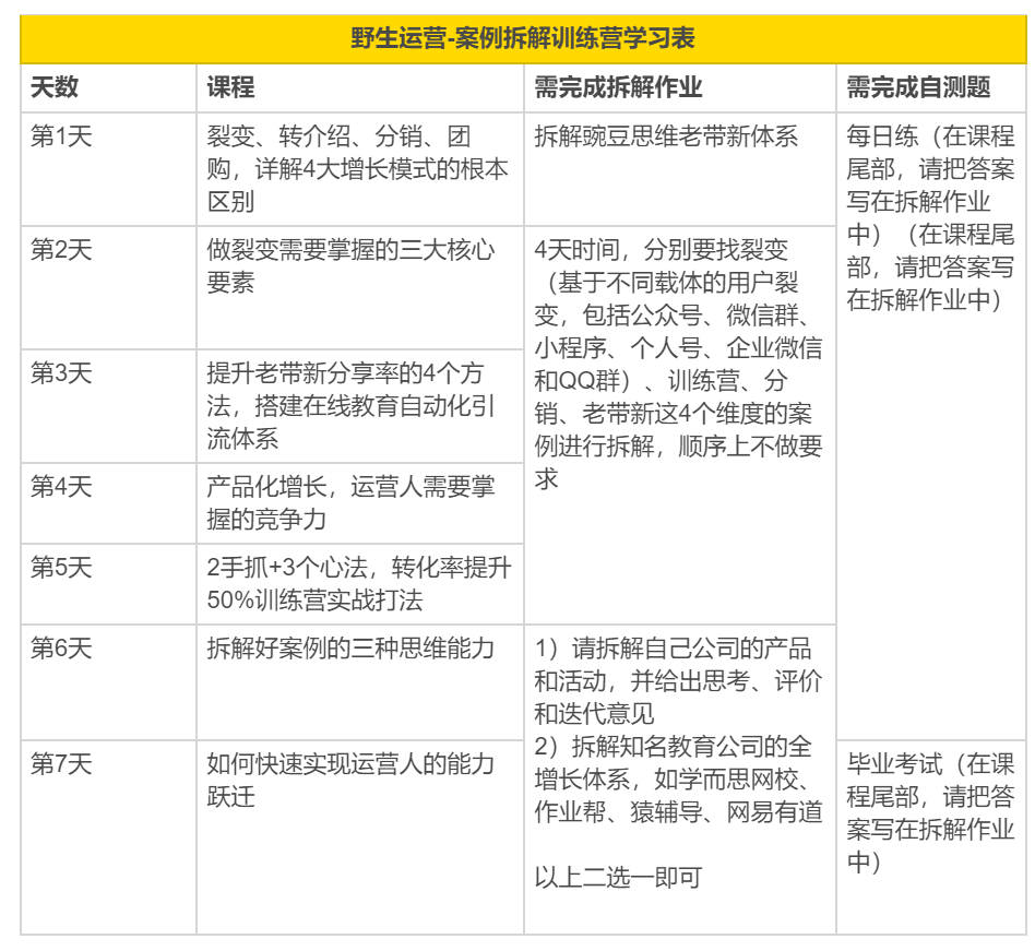 拆解案例活动的最终目的,不是让大家拆解越来越多的案例,而是通过对有限案例的拆解,获得增长能力,所以野生运营的拆解训练营重点在于: