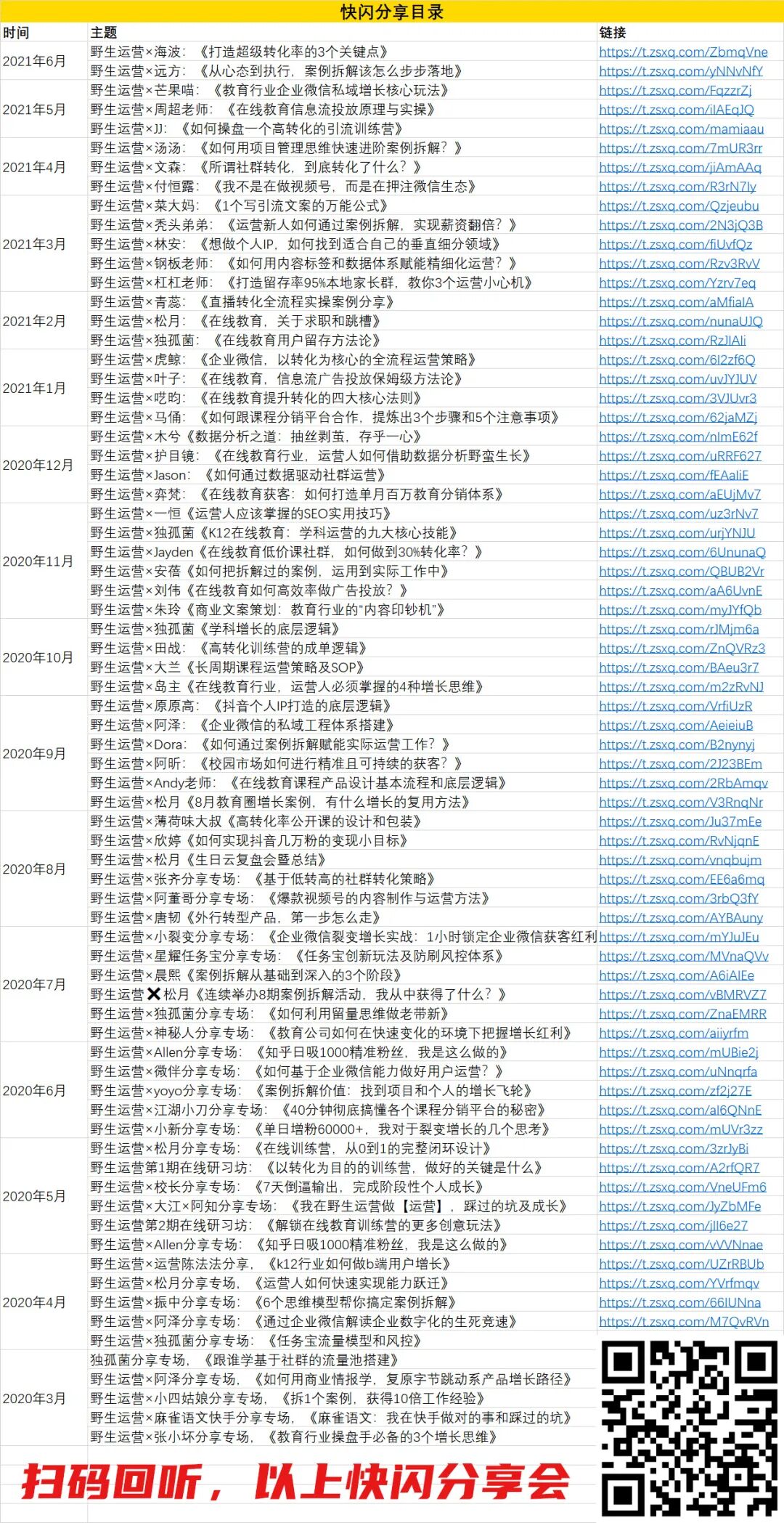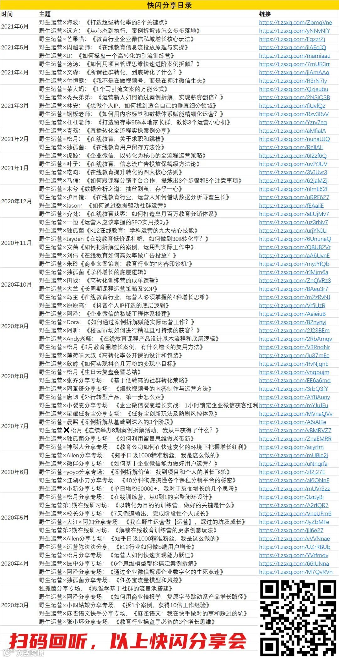 分享我最近一年感受颇深的一点,熟悉野生运营知识星球的小伙伴都知道,咱们知识星球每周日雷打不动会组织各种主题的快闪群分享,至今已累计了 100+场,松月既是组局者,也是学习者,每周日的高频学习对我产生的影响非常大,也是我最近一年能高速成长其中很重要的原因。今天根据“价值感”和“受欢迎程度”两个维度精选 21 个你值得回听的分享会,希望对你有帮助。
