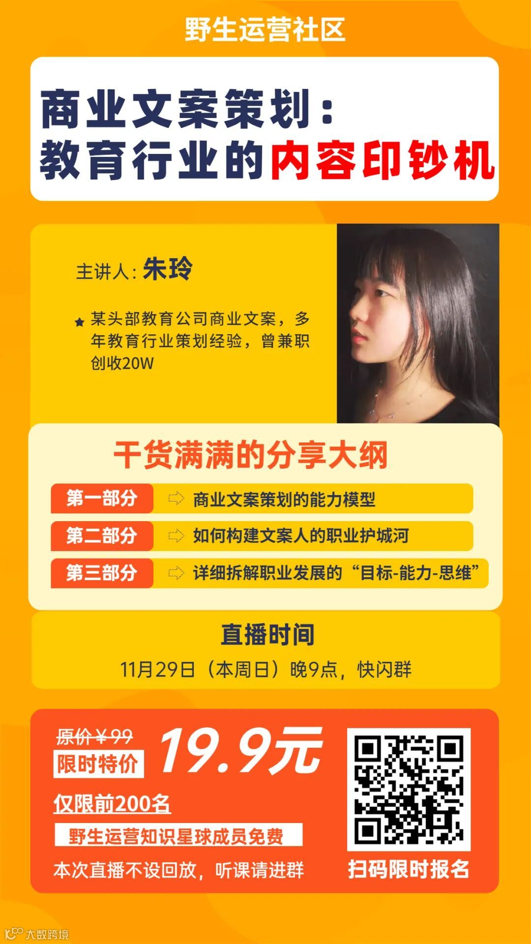 本周日(11月29日)晚9点,野生运营邀请来某头部教育公司商业文案朱玲老师,跟你分享《商业文案策划:教育行业的“内容印钞机”》,帮助你找到在线教育行业,写好一篇短/中/长文案的心法,把文字真正变成流水,报名截止本周日(11月29日)晚8点,且本次分享不设回放!
