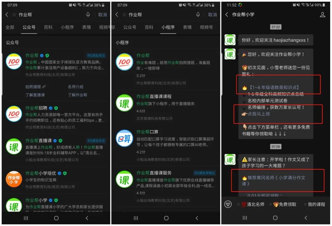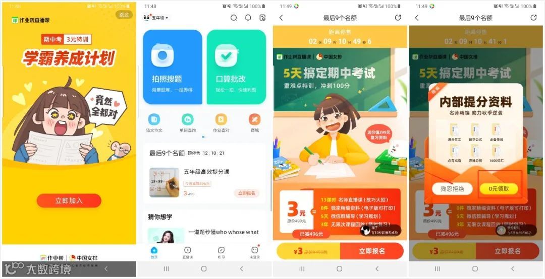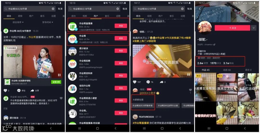 作业帮的购买价格非常容易接受0元,3元,流量池够大,矩阵够复杂,且各种套路不复杂。