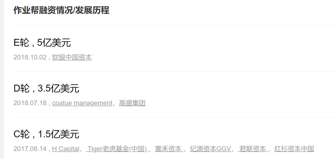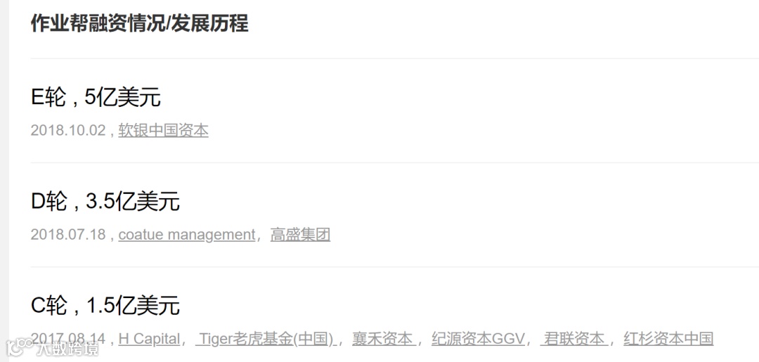 作业帮致力于为全国中小学生提供全学科的学习辅导服务,作业帮累计激活用户设备突破8亿,月活用户约1.7亿 ,是中小学在线教育领军品牌。 目前作业帮已经经历了5轮融资,融资已经超过15亿美元。