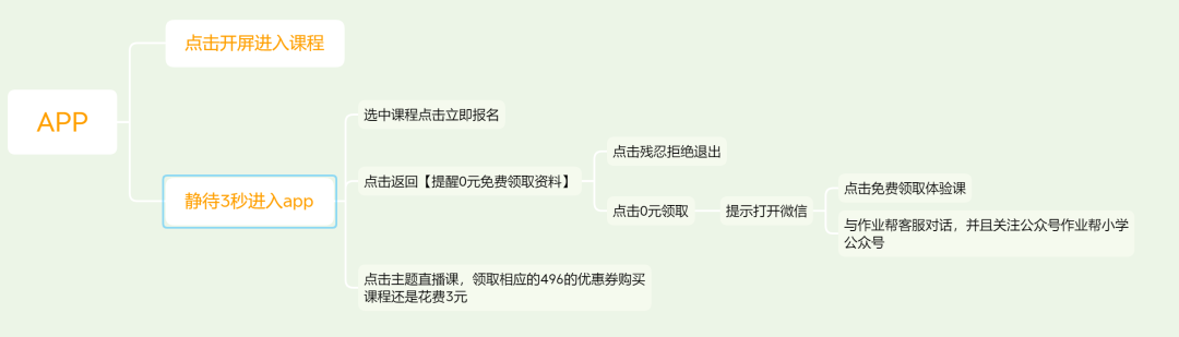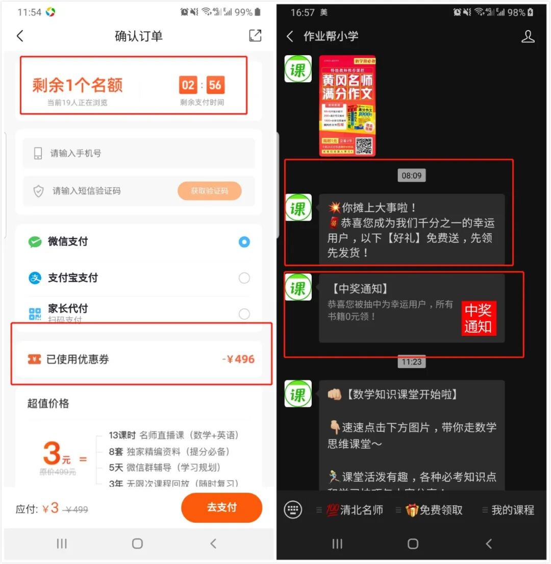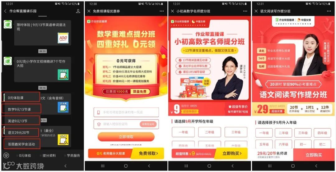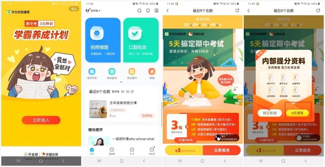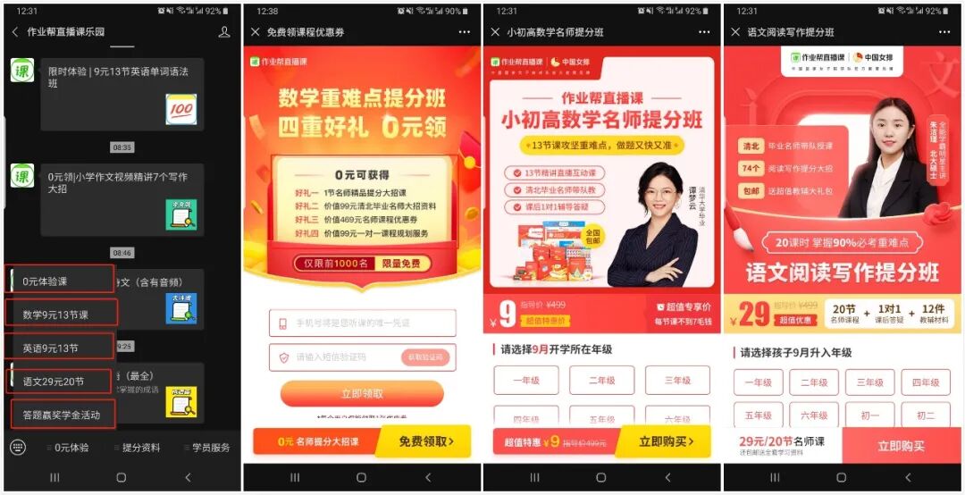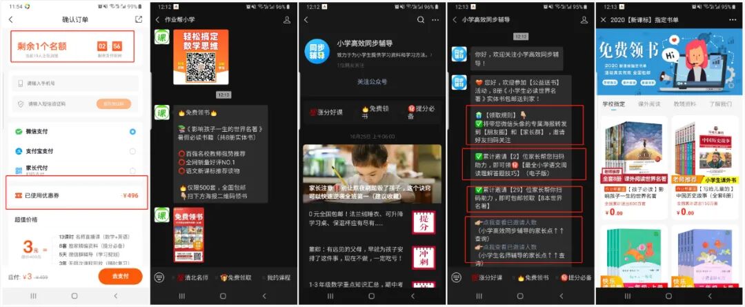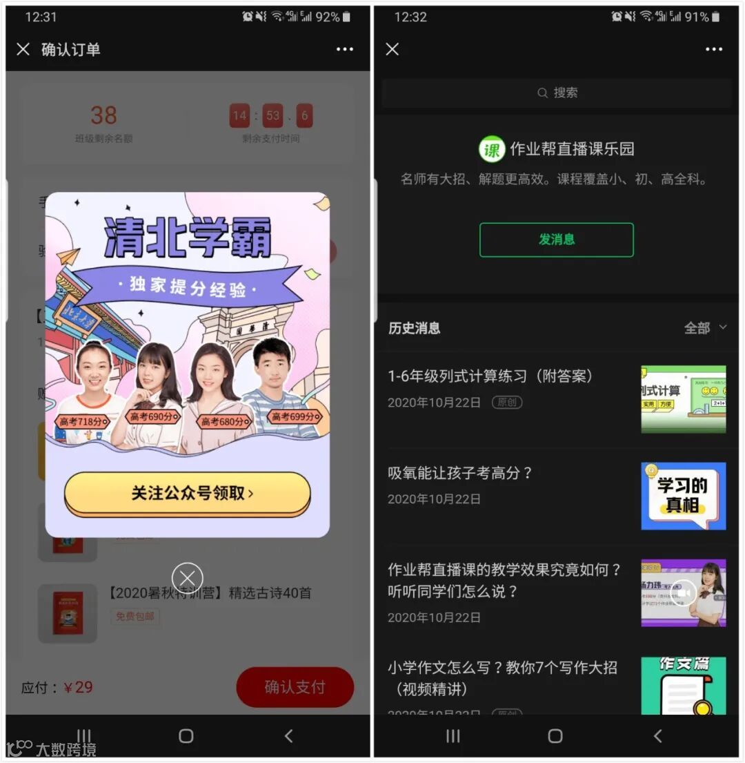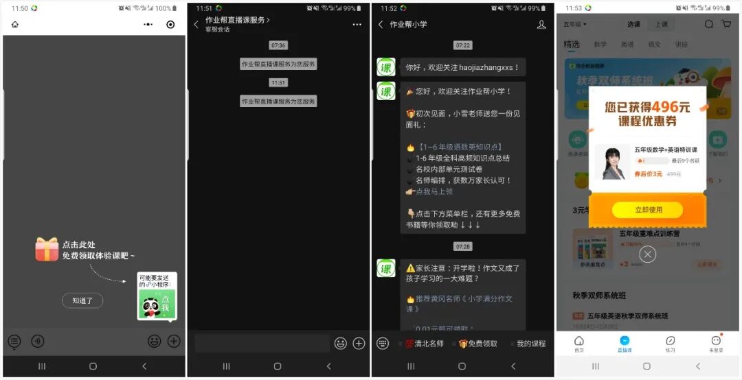 其次作业帮的 文案设计也是很有心思的,例如0元领取,不报名,退出引流到公众号,噱头免费送资料,包括后面的付款界面用了仅剩一个名额从焦虑性隔几个小时会恭喜你成为给到用户惊喜的感觉感觉自己是幸运儿。心理上就已经占了优势。每个只要你关注的公众号隔几个小时就会给push各种花式的消息,各种吸睛的文案以及免费赠送的套路都是让你不断的在他的流量池里循环触达