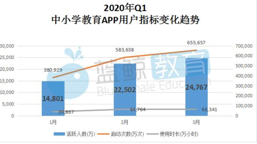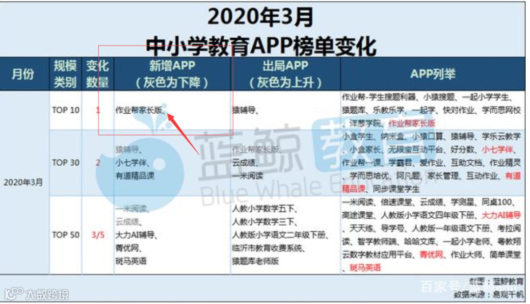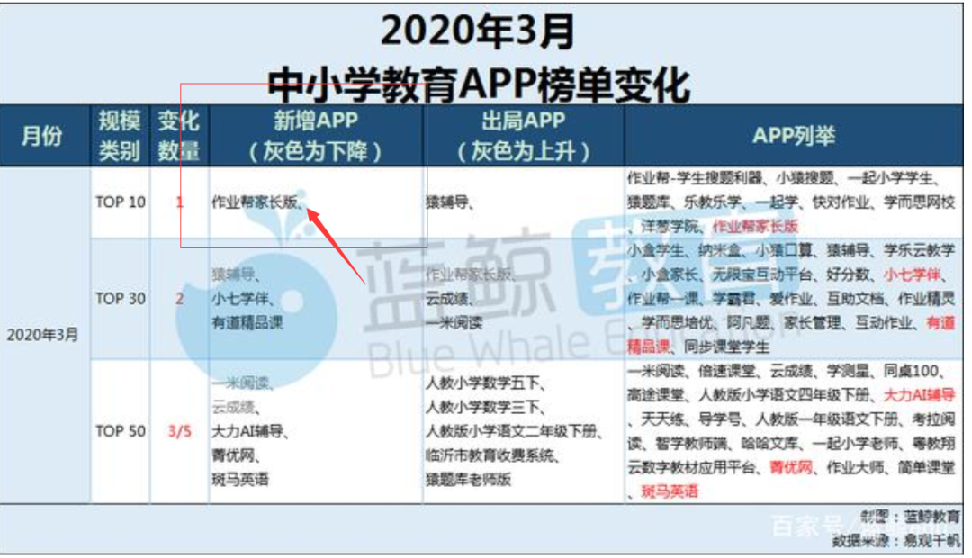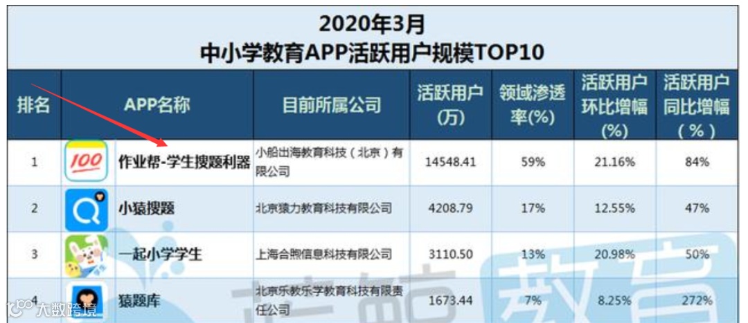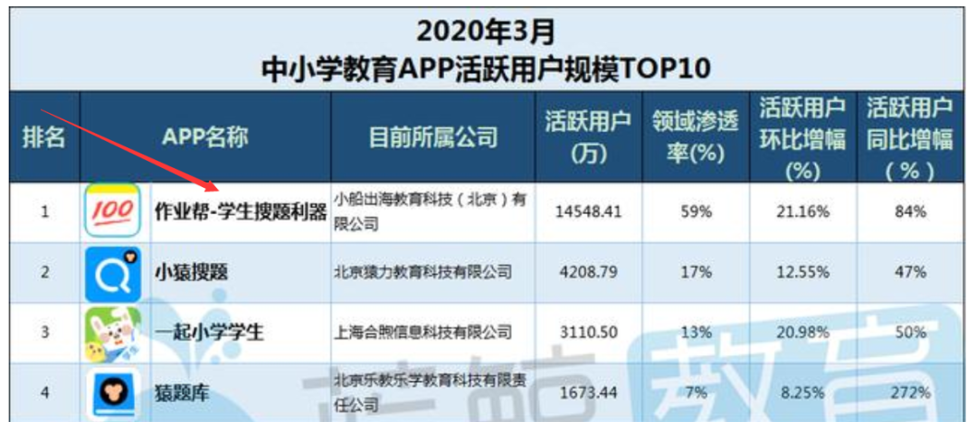 从今年中小学教育app用户指标变化趋势来看,大家都逐渐熟悉线上授课模式,3月榜首“作业帮”于2020年2月末用户突破亿级规模,3月末环比增幅21.16%,再创新高,月活达14,548.41万,约1.45亿,领域渗透率也从2月末的53%上升至59%,进一步扩大影响力,可谓强者愈强,马太效应进一步加剧。