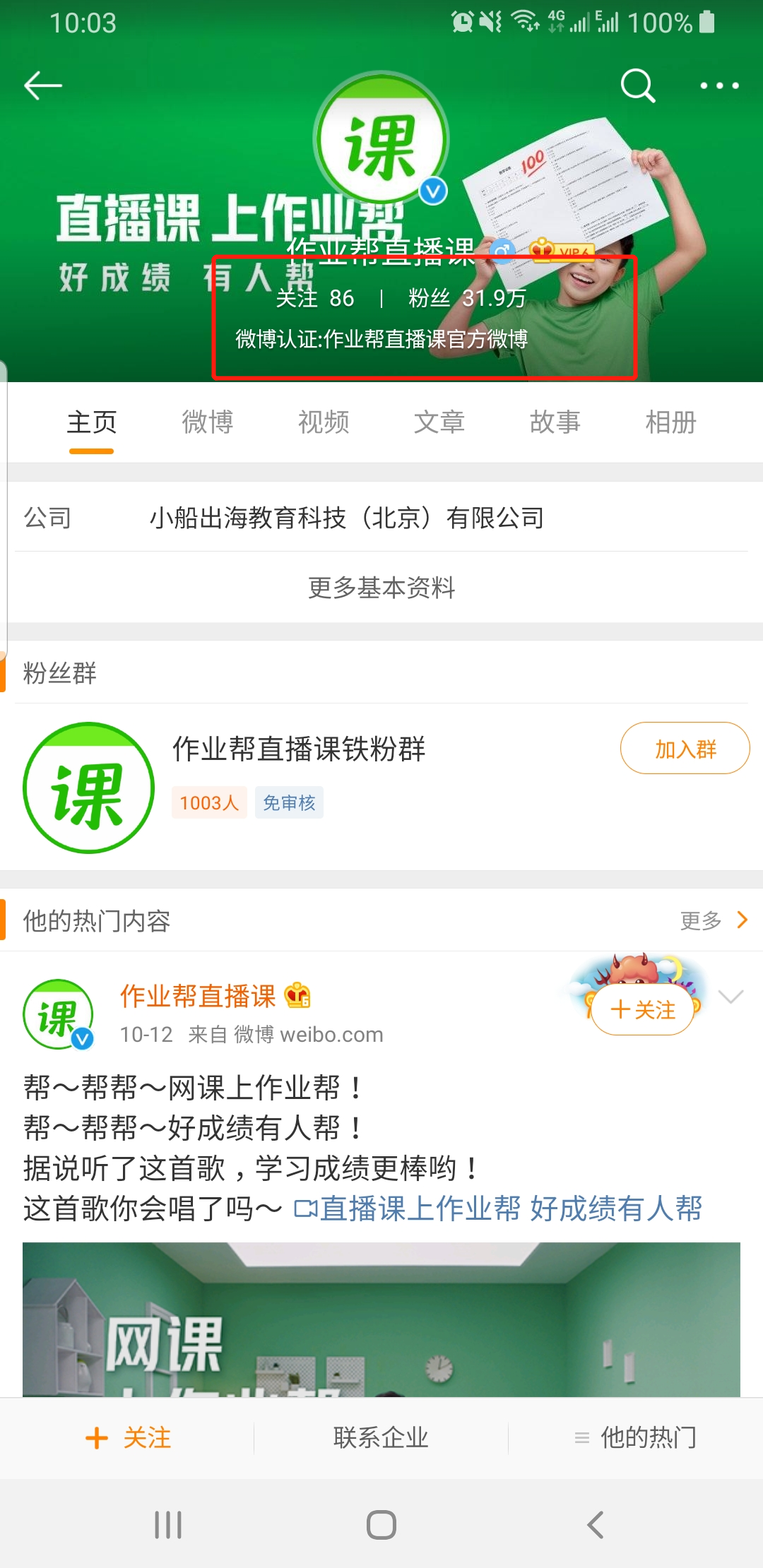 31.9w粉,微博主要是明星营销,例如作业帮的洗脑神曲,均被各大明星传颂,神曲也上了例如湖南快本,天天向上等知名节目。为品牌的宣传背书起了很好的作用。